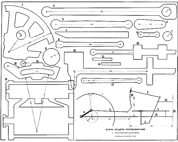 Рис. 13. Схема кулиссы Гейзингера паровоза 1–3–1 — «С» со всеми размерами в миллиметрах.Сохраняя размеры этого рисунка, мы можем начертить еще несколько таких же для различных положений ведущего кривошипа, крейцкопфа и опережающего ведущий кривошип на примерно четверть оборота кулиссного кривошипа. Или, по старой памяти, мы можем изготовить подвижной чертеж из полосок бумаги и двигать его из одного положения кривошипа в другое. Исследовав тем или другим способом полный оборот ведущего колеса, мы увидим следующее. При положении кулиссного камня по средине кулиссы, хотя она и совершает размахи, но не оказывает никакого влияния на движение золотника. Он, как и раньше в первом нашем подвижном чертеже парораспределения, получает движение только от маятника, соединенного с крейцкопфом; стало-быть при этом получаются только предварительные впуски пара около мертвых положений кривошипа. Затем мы обратим внимание на следующее. Поставим поршень в одно из крайних положений, а кулиссный кривошип в средине; мы можем в этом положении представить себе, что передвигаем камень кулиссы в ее прорезе из среднего положения в то или другое крайнее, и при этом золотник не шевельнется: точка его соединения с концом золотниковой тяги остается недвижимой. Совсем иное будет дело, если кулисса в наклонном положении вправо или влево. Если передвигать камень теперь из конца в конец кулиссного прореза, то золотниковая тяга заставит двигаться золотник, увлекая его вправо или влево, в зависимости от того, куда имеет наклон кулисса. При этом золотник передвигается из одного крайнего положения в другое. Теперь представьте себе, что мы поставили кулиссный камень в самый нижний конец кулиссы, когда поршень занимает левое крайнее положение в цилиндре и машинист открыл регулятор, впуская пар через перегреватель в золотниковую коробку. Допустим, что это мы рассматриваем правую машину паровоза. Для пара открыт ход под поршень (предварительный впуск). Как только левая машина паровоза сдвинет кривошип нашей правой машины с мертвой точки, под давлением пара поршень ее двинется, приводя в движение весь парораспределительный механизм; кулиссный кривошип потянет нижний конец кулиссы влево, и кулиссная тяга увлечет влево же золотник, который будет открывать левое паровпускное окно, и машина движется вправо (передний ход). Пусть поршень займет положение, изображенное на рисунке 9 цифрой V; если в этом положении мы начнем двигать кулиссный камень из крайнего положения в среднее, мы увидим, что золотник движется вправо и закроет паровпуск раньше, чем это случилось бы, если бы кулиссный камень оставался в своем крайнем положении. Но движение поршня при этом не изменяется. Сократилась только отсечка пара и уменьшилось наполнение цилиндра свежим паром. Стало-быть, наша кулисса дает возможность паровозу работать при разных наполнениях цилиндра. Когда кулиссный камень занимает крайнее положение, — размахи золотника самые большие, впускные каналы открываются надольше, и паровоз работает с наибольшими наполнениями. Около средины — с малым. Если же камень в среднем положении, то пар все-таки подается в цилиндр, так как золотник движется маятником от крейцкопфа, и при открытом регуляторе паровоз может сдвинуться с места.