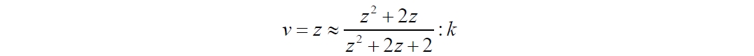Странный знак минус с неясными обоснованиями следует отбросить. Из исправленного уравнения, отбрасывая величины высших порядков малости, можно получить традиционное уравнение приближенных значений скорости для z << 1