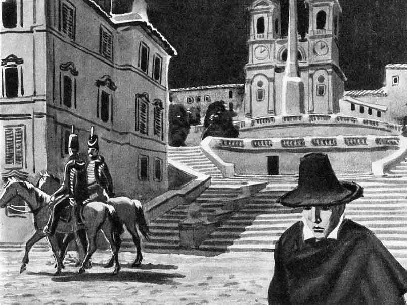 Гостей-иностранцев поражала пышность этого бала. «Никакие празднества монархов Европы не могут с ним сравниться», — говорили они. У монархов Европы нет дворцов, созданных итальянским зодчеством; они вынуждены приглашать своих придворных дам, между тем как герцог де Б… приглашал только красивых женщин. В этот вечер его выбор оказался особенно удачен: мужчины были ослеплены. Собралось столько пленительных женщин, что трудно было решить, кому отдать пальму первенства. Но после недолгих колебаний царицей бала единодушно провозгласили княжну Ванину Ванини, черноволосую девушку с огненным взором. Тотчас же иностранцы и молодые римляне, покинув гостиные, столпились в бальной зале. Отец девушки, князь Аздрубале Ванини, пожелал, чтобы она прежде всего протанцевала с двумя-тремя немецкими владетельными принцами. Затем она приняла приглашение нескольких англичан, весьма красивых и весьма знатных, но их накрахмаленный вид наскучил ей. Больше удовольствия ей, казалось, доставляло мучить молодого Ливио Савелли, по-видимому, страстно в нее влюбленного. Ливио был одним из самых блестящих молодых людей в римском обществе и тоже носил княжеский титул; но, если б ему дали почитать какой-нибудь роман, он на двадцатой странице отбросил бы книгу, заявив, что у него разболелась голова; в глазах Ванины это было большим недостатком. Около полуночи на балу распространилась новость, которая вызвала много разговоров. В этот самый вечер из крепости Святого Ангела[1] бежал, перерядившись, содержавшийся в заключении молодой карбонарий; уже достигнув последних ворот тюрьмы, он в пылу романической отваги напал с кинжалом на солдат охраны, но его самого тоже ранили. Сбиры[2] гонятся за ним по кровавым следам и надеются поймать его. Пока все толковали об этом побеге, дон Ливио Савелли, восхищенный прелестью и успехом Ванины, почти обезумев от любви, воскликнул, провожая ее к креслу после танцев: — Но скажите, бога ради, кто мог бы понравиться вам? — Молодой карбонарий, бежавший сегодня из крепости. По крайней мере он что-то совершил, а не только дал себе труд родиться[3]. Князь Аздрубале подошел к дочери. Этот богач уже двадцать лет не требовал отчета от своего управителя, а тот давал ему в долг под весьма высокие проценты его же собственные деньги. Встретив князя на улице, вы приняли бы его за старого актера; вы даже не заметили бы, что пальцы у него унизаны массивными перстнями с очень крупными бриллиантами. Оба его сына вступили в орден иезуитов[4], затем сошли с ума и умерли. Он забыл их, а на свою единственную дочь Ванину гневался за то, что она не выходит замуж. Девушке уже девятнадцать лет, а она отвергает самые блестящие партии. В чем тут причина? Причина была та же самая, которая побудила Суллу[5] отречься от власти: презрение к римлянам. Наутро после бала Ванина заметила, что ее отец, человек на редкость беззаботный, никогда в жизни не бравший в руки ключа, чрезвычайно старательно запер дверь на узкую лесенку, которая вела в комнаты, расположенные на четвертом этаже дворца. Окна этих комнат выходили на террасу, заставленную апельсиновыми деревцами в кадках. Ванина отправилась в город с визитами; когда она возвращалась, парадный подъезд был загроможден сооружениями для иллюминации, и карета въехала через задний двор. Ванина подняла глаза и, к удивлению своему, у