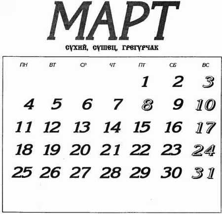 В марте день с ночью меряется, равняется. В марте курица из лужицы напьется. В марте и сзади и спереди зима. В марте югом веет, старого греет. Иногда март морозом гордится. Март — ветронос, водотек, протальник. Март — грачевник, грачей пригнал. Налетели грачи, стали зиму топчи. Март, зажги снега, заиграй овражки! Март — зимобор, с зимой борется. Март зиму-зимскую на нет сводит. Март и снегом сеет, и солнцем греет. Март месяц любит куролесить. Март не весна, а предвесенье. Март неверен: то плачет, то смеется. Март позимье кончает, апрелю пролетному путь-дорожку кажет. Март у матери-зимы шубу купил, а через три дня ее продал. Мартушка еще закружит метельную вертушку. На исходе марта щука хвостом лед разбивает. Пришел март-марток — надевай двое порток. Раненько март веснянку затягивиет — ненадежная эта песня. Синичка в марте запела — весеннее тепло ворожит. С марта пролетье, весна начинается. У раннего марта — апрельские проталины.