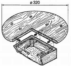 Головку швейной машины вместе с петлями временно снимают с корпуса. Его наружные поверхности шлифуют шкуркой до блеска; внутреннюю полость тонируют морилкой. Снаружи корпус многократно покрывают лаком. Некоторым швеям удобнее шить на машине, оборудованной рабочим столиком. Очень удобен столик в виде диска с вырезанным сектором, крепящийся к корпусу. Столик изготавливают из столярной плиты толщиной 20–22 мм, кромки закругляют, поверхность шлифуют и покрывают лаком. Вырезав сектор, подгоняют столик к корпусу с минимальными зазорами. Для столика подойдет сиденье из шлифованной столярной плиты от старого табурета. Столик крепят тремя винтами М6, вкручиваемыми в резьбовые втулки (от мебельных сборочных уголков), установленные в торцах панели столика (рис. 2).