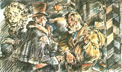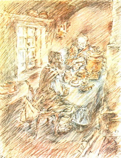 — О чём, братец, горюешь? — спрашивает. Поглядел на него Савелий недоверчиво, насупился было (ишь любопытный какой!). Но видит — и правда хочет ему барин помочь. Рассказал про свою беду. Тот задумался, потом говорит: — Приходи завтра к вечеру ко мне. Живу я у Синего моста, в доме Российско-Американской компании. Спросишь Кондратия Фёдоровича Рылеева. А я тем временем подумаю, как делу твоему помочь. На следующий день Савелий, робея, позвонил в дверь двухэтажного дома на Мойке. Старый слуга рылеевский, Никита, сперва встретил его строго. Седые бакенбарды важно разгладил, сказал: — Не вернулся ещё Кондратий Фёдорович. На кухню ступай, обожди, да ноги вытри получше, наследишь! Но потом рядом присел, разговорился с Савелием, горю его посочувствовал, житьё-бытьё деревенское вспомнил. Подобрел, самовар поставил. Сидят Никита с Савелием, беседуют неторопливо, степенно. Отставил Савелий кружку и говорит: — Хороший у вас, Никита Мартынович, барин. Добрый, простой. А имя у него не господское — крестьянское. Отчего это? Усмехнулся Никита, чай с блюдечка отхлебнул: — Имя ему цыганка нагадала. — Как так? — удивляется Савелий. — Да вот так, — отвечает Никита. — Слушай.
