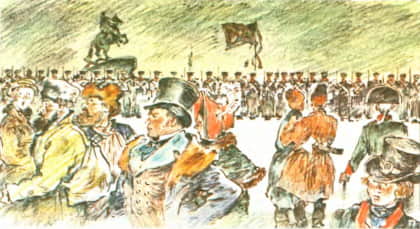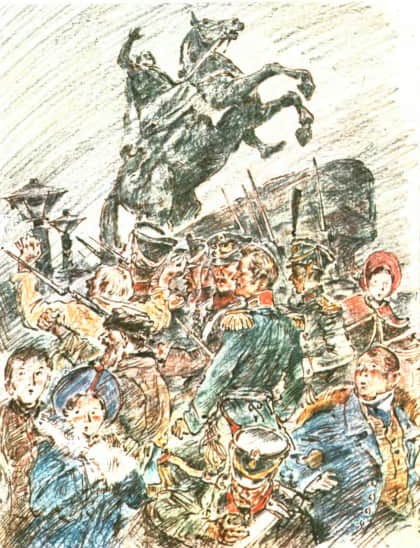 Вот рассвело, и декабрьское багровое солнце повисло в холодном небе столицы. Час прошёл, другой, третий. Никита выглядывал в окно: не вернулся ли Кондратий Фёдорович? Нет, не видать. Прошла укутанная краснощёкая молочница. Цокая копытами, протрусила мимо лошадь водовоза, пробежали с криком мальчишки. Всё, кажется, как всегда, да чуял Никита: что-то странное творилось в Питере. Проскакал эскадрон гвардейцев на вороных конях, где-то неподалёку бухнул выстрел, потом другой. Выстрелы гремели недалеко, за стройкой Исаакиевского собора, где-то у Сенатской площади. У Никиты сердце ёкнуло: началось, недаром барыня плакала. Там стрельба, того и гляди, убьют Кондратия Фёдоровича. А может, ранили его уже, а помочь ему некому? Схватил Никита свой зипунишко, лисий треух нахлобучил и, барыню не спросясь, за дверь выбежал. От Синего моста до Сенатской площади рукой подать. Вокруг площади колыхалась толпа народа. Были здесь и мужики, и мастеровые, и господа — в цилиндрах, богатых шубах, и мальчишки (как же без них?). Встав на цыпочки, вытягивая шеи, вглядывались они в ряды солдат в серых шинелях, застывшие у Медного всадника — памятника императору Петру. А между ними и толпой — другие войска, словно кольцо вокруг тех, в серых шинелях. Молодой мастеровой толкнул Никиту в бок: — Гляди, дядя: вон сам царь Николай! Вон тот молодой красавчик с голубой лентой! Император и впрямь был красив. Мундир ему к лицу, белый конь с чёрной гривой — как на картинке. Только лицо — бледное, растерянное. Губы кусает и тоже, как все, смотрит на площадь. Никита опять на солдат у Медного всадника поглядел — и только теперь заметил среди серых шинелей две-три фигурки в штатском, в шубах. Показалось даже, что узнал Кондратия Фёдоровича, да разве издалека разглядишь! Забыл и царя, и мастерового — стал проталкиваться через толпу, пробился в первые ряды. Дальше ткнулся было — да два гвардейца-усача ружья сомкнули: — Проваливай, не велено! Взмолился Никита: — Что же там приключилось такое, братцы?