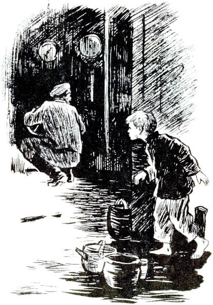 Максим взглянул в лицо старика и понял, что хоть суров и строг его взгляд, а добрый: деда-бахчевника напомнил. — Дедушка, возьми меня с собой! — Куда ты? У нас дело военное. — Возьми, дедушка! — опять стал просить Максим, заплакал и кое-как рассказал о беде, что с ним стряслась. Дедушка сказал чёрному: — Возьми его, Леонтий, за маслёнщика. Парнишка добрый. Чёрный пощупал мальчика крепкими клещами пальцев со всех сторон и сказал: — Мальчонка ничего, крепкий. Худ больно только. Тощой. — Отойдёт… откормим. — Как тебя звать? — Максимом. — Видишь, парень, какое дело: маслёнщика у нас, такого же, как ты, убило. Дело у нас боевое. Не сробеешь? — Нет. — Ну, иди на пароход… Я сейчас приду. Максим прошёл на пароход по сходням и мимоходом прочёл на обводе колёсного кожуха название парохода: «Ермак». Мимо Максима хлопотливо бежали с ношей на спине крючники, покрикивая встречным: — Позволь! Позволь! Максим, чтобы не мешать им, робко прижался к стенке и ждал. Скоро пришёл Леонтий, крепко взял мальчика за плечо и, открыв дверь, подтолкнул его вперёд. Перед Максимом открылась тёмная, горячая яма, где вздрагивали и плясали отсветы огня, сверкая на каких-то блестящих скалках. Вниз вела крутая железная лесенка с гладким стальным поручнем. Холодея от страха, Максим скатился вниз, на клетчатые железные плиты пола. Направо сквозь окошечко топки выплёскивал языками белый огонь. В топке оглушительно ревело пламя. Налево быстро мелькало колесо, и через него бежал, щёлкая сшивкой, погон. Это несколько успокоило ошеломлённого Максима: что-то подобное он видел на помещичьей молотилке в степи. «Машина!» — подумал он. У машины возился, что-то подтягивая большим ключом, тщедушный бритый человек. Хотя он стоял согнувшись, но Максим сразу понял, что человек этот высокого роста — остро согнутые в коленках ноги и длинные руки. «Он вроде паука», — подумал мальчик. Леонтий прокричал над ухом рабочего: — Товарищ Алексей, я тебе нового маслёнщика привёл! Алексей поднял голову, взглянул мельком на Максима и опять стал что-то подвёртывать и постукивать у машины… Потом он поднялся, тонкий и худой, недружелюбно оглядел мальчика и спросил Леонтия: — Где это ты нашёл такую рвань? — На берегу. — А что скажет товарищ командир? — Что скажет? Нам без маслёнщика бежать[1] никак нельзя. — Смотри сам, как знаешь. Леонтий, склонясь к мальчику, сквозь рёв огня закричал ему: — Айда учиться! Он подвёл его в угол, где около железных кадок с крышками и кранами на большом противне, вроде тех, на каких пекут пироги, стояли железные чайники, банки и кувшины с длинными носами. Противень был залит тёмным маслом. — Вот это мазут, — говорил Леонтий, перекрывая шум, — это олеонафт, а это ойльдаг, — указывал он на разные посудины. Потом он подвёл мальчика к сияющей стальными и медными скалками и скрепами машине и стал объяснять, как открывать, отвёртывая или откидывая крышки, маслёнки и куда какое наливать смазочное масло. У мальчика кружилась голова от шума, от натужного желания понять и не проронить непонятные названия и слова. От жары и волнения Максим обливался горячим потом, сердце стучало, грудь тяжко вздымалась, вдыхая густой и липкий, пахучий воздух машинного трюма. И вместе с тем Максим чувствовал, что привычный за последние недели утренний озноб отступает, сжимается, прячется где-то внутри, словно испуган