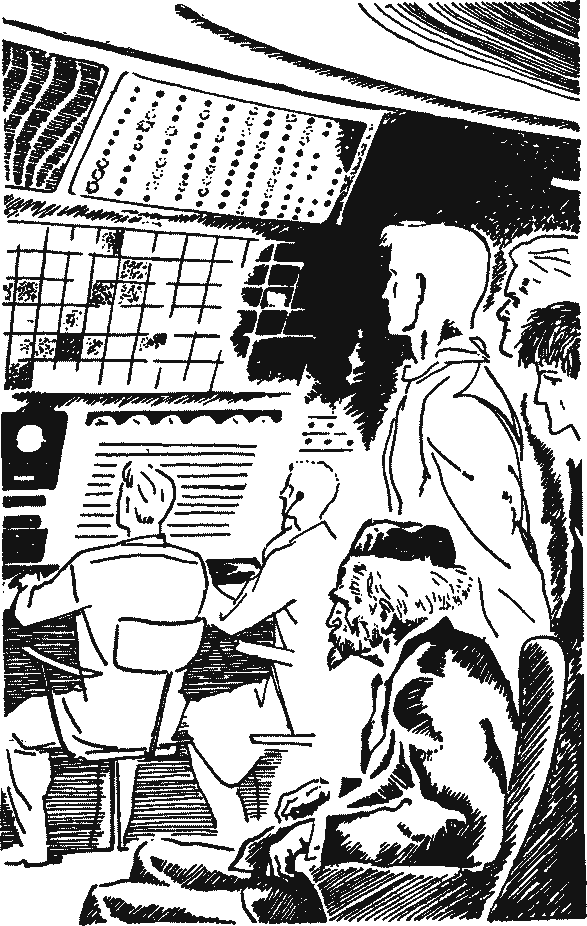 Селеногорск по праздникам будто вымирает. Большинство селенитов улетает на шарик, остаются лишь самые необходимые вахты. Я шёл пустынными селеногорскими коридорами, скользя взглядом по стенам, разрисованным и исписанным здешними остряками. Устрашающее табло «Не входить!» над дверями Узла космической связи не горело. Я постучался — никто не ответил. Неужели и Робин улетел на праздники? Дверь поддалась нажиму, я вошёл в холл. Здесь никого не было, кроме вычислительного автомата, из пасти которого торчал, как язык, кусок бледно-розовой плёнки. Я выдернул плёнку, посмотрел — ряды цифр и знаков. Из-за двери аппаратной донеслись голоса. Я заглянул туда.