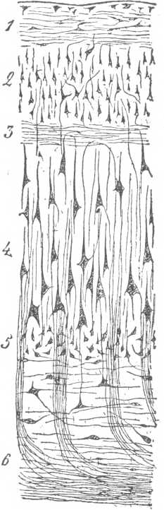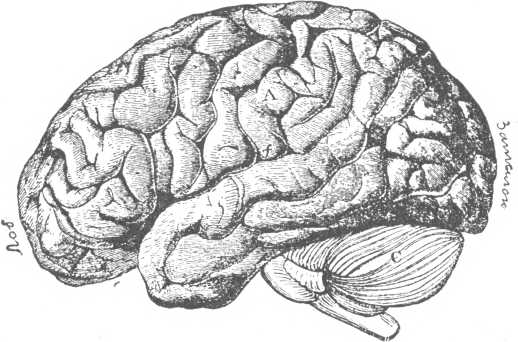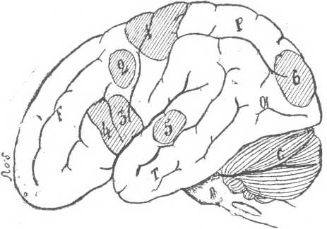 Направо — кончик языка. Видно, что язык — та же мышца или, вернее сказать, множество мышц, лежащих одна на другой таким способом, что от их сокращения язык может двигаться на тысячу разных способов, как это и бывает при разговоре. Чтобы эти мышцы сокращались так или иначе, к ним должно сначала притти раздражение из мозга, из того самого центра его, который и заведует человеческою речью. Это место было указано на рисунке, напечатанном на 121 странице (4). Нервы, идущие от мозга к языку, обозначены цифрами 1, 2, 3, 4, 5. Все они ветвятся, и каждый идет к своей мышце. Смотря по тому, к каким мышцам языка придет раздражение из мозга, те и будут сокращаться. Мышцы обозначены латинскими буквами а, b, с, d.