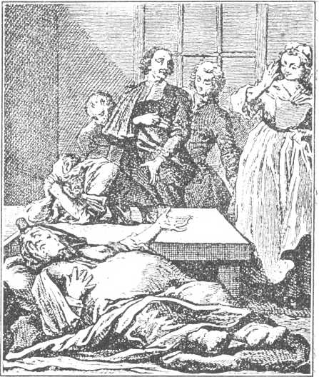 Коарен получает исцеление от горсточки земли, принесенной с могилы Франсуа де-Пари.(Рисунок того времени.)