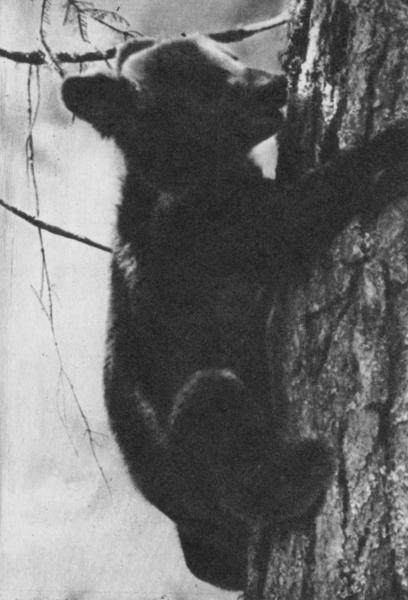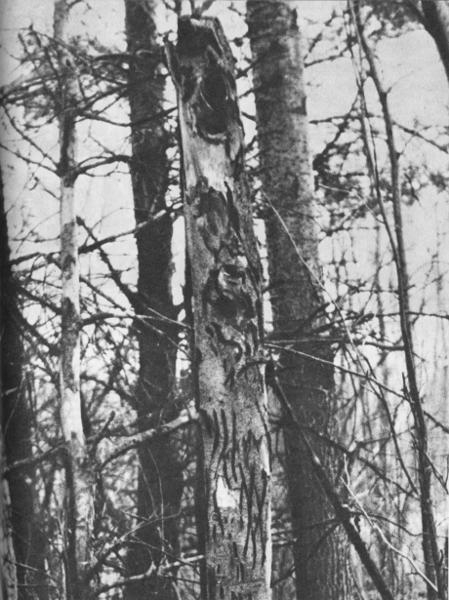 Эти «медвежьи метки» на стволе осины — тоже следы путешествия медведя вверх по стволу. На этот раз путешествие завершилось успешно — зверь добрался до вершины, обломал молодые ветки, накидал их на землю, благополучно спустился вниз, полакомился молодыми, сочными листьями и побрел дальше. Обычно следы таких путешествий встречаются очень редко — медведи забираются на вершины деревьев в поисках корма лишь тогда, когда в лесу нет богатого подлеска, когда лес беден кормом. И только в сибирской тайге в пору, когда созревают кедровые орехи, звери с охотой лазают на кедры. Здесь медведя не пугает никакая высота — ради кедровых орехов медведь готов лезть даже на самый высокий кедр.