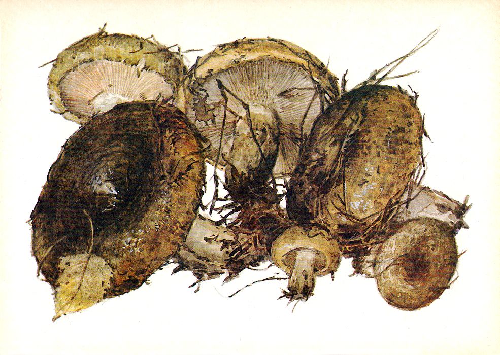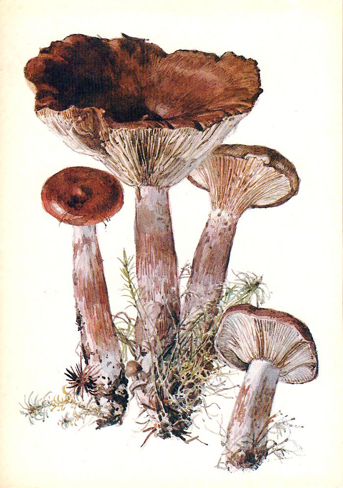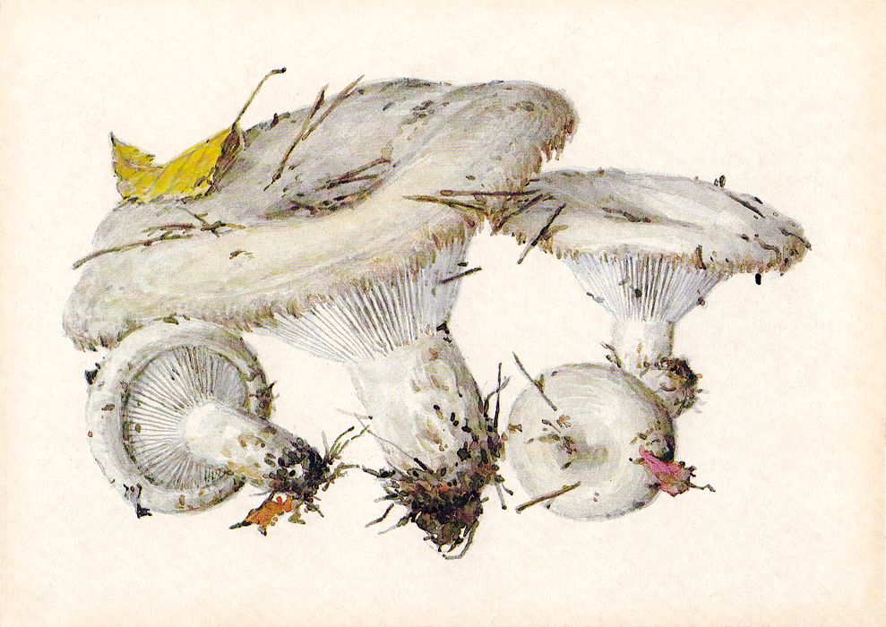 Груздей в природе несколько видов. Лучшие из них — настоящий и желтый. Шляпка настоящего груздя достигает 10–22 см в диаметре. У молодых грибов она почти плоская или вдавленная посредине, с завернутым внутрь пушисто-мохнатым краем, позднее воронковидная. Шляпка слизистая, от молочно-белой до слегка желтоватой, нередко со слабозаметными концентрическими прозрачно-стекловидными полосами, иногда с буроватыми пятнами… Пластинки белые, с желтоватым краем, приросшим к ножке или слегка низбегающие по ней. Мякоть белая, плотная, но ломкая, имеет острый приятный «груздевый» запах. На изломе выделяет белый едкий сок, который на воздухе желтеет. Ножка короткая, цилиндрическая, внутри полая. Встречаются грузди настоящие с июля по октябрь не часто, но обильно, больше всего в северных и северо-западных областях РСФСР, на севере центральных областей, в Верхнем и Среднем Поволжье, на Урале и в Западной Сибири. Растут они в березовых и смешанных с березой лесах, чаще всего большими семьями. Искать их нужно тщательно, так как они обычно приподнимают слой опавшей листвы и хвои, а не стоят открыто. Гриб этот съедобный. 1-й категории. Идет только в засол, соленые грузди имеют голубоватый оттенок, мясисты, сочны, ароматны, издавна славятся в хлебосольной русской кухне. В Сибири в старину груздь считали за единственный гриб — других просто не брали.