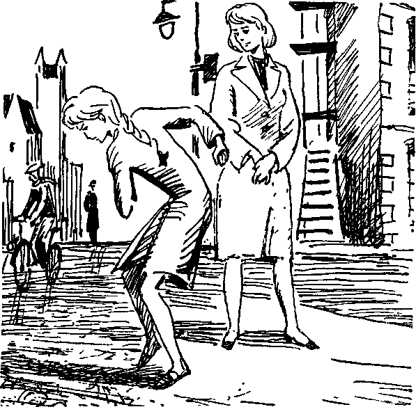 — Мама! Елизавета Карповна подняла голову — перед ней стояла Антошка и пытливо вглядывалась в ее лицо. — Ты о чем-то все думаешь, мама? — О многом, лапонька, о многом. И прежде всего о том, что нам давно пора быть в управлении военно-воздушного флота. Пойдем. Вышли на улицу к остановке омнибуса. На широкой полосе тротуара, недалеко от остановки, пожилой человек, сидя на раскладном стуле, рисовал разноцветными мелками на асфальте. Влажная прядь волос отпала и обнажила бледную лысину в продольных морщинах. Возле ограды лежала опрокинутая шляпа, и в ней поблескивало несколько монет. Антошка подошла ближе. Человек рисовал карикатуру на Гитлера: изобразил фашистского главаря в виде кривляющейся испуганной обезьяны. В лапах у обезьяны два банана, сросшиеся буквой «V». Художник стал приглашать людей из очереди: