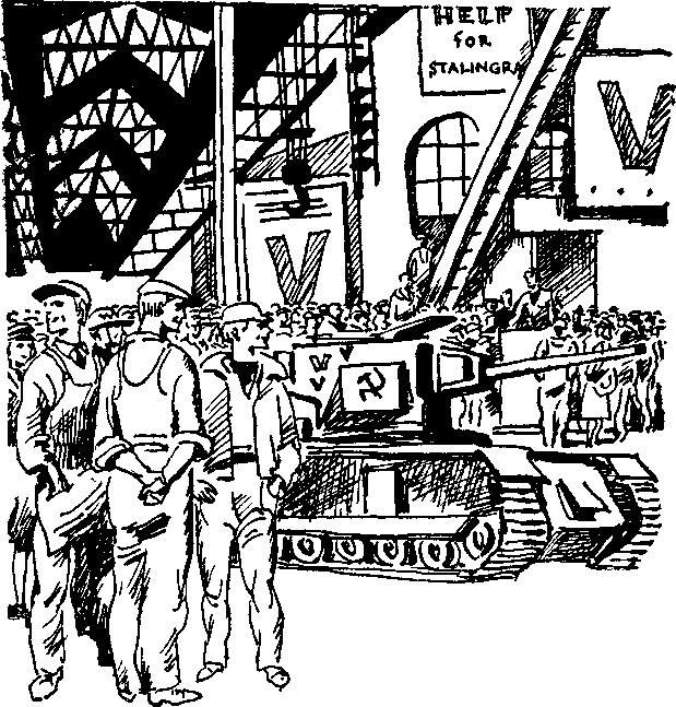 Антошка, закусив нижнюю губу, старательно вывела эмблему. — Спасибо, мисс. Эти танки мы отправляем в Россию. Рабочие подходили, смотрели на эмблему и переносили ее на другие танки. Эти грозные машины рабочие создавали для Красной Армии и впервые в жизни понимали, что значит работать на себя, на победу. Делали их по-хозяйски, соревновались, кто лучше и быстрее выполнит работу. Так пролетарская солидарность рождала на капиталистическом предприятии радость труда. На трибуну поднялся очередной оратор. Площадь постепенно смолкала, и в наступившей тишине прозвучал вопрос: — Почему правительство Великобритании не держит своего слова, не открывает второго фронта? — Почему? — ухнула единым голосом площадь. — Мистер Черчилль обещал открыть второй фронт, когда еще не опадут последние листья на деревьях. Уже опали волосы на голове премьера, а о втором фронте что-то молчат… — Позор! — тысячеголосым эхом отозвалась площадь. — Предлагаю послать нашему правительству письмо с требованием немедленно открыть второй фронт, высадить английские войска в Европе. Площадь гудела. — Правильно!!! Открыть второй фронт!!! Да здравствует победа над фашизмом! Да здравствует Красная Армия!!! В воздухе замелькали белые листки. Рабочие ловили их и, приложив к корпусу танка, ставили подписи под требованием открыть второй фронт. Сотни листков. Тысячи подписей. Единый порыв, какое-то необъяснимое чувство локтя, единодушия царило на площади. Взревели моторы, синий дым окутал площадь, и, расступаясь, рабочие пропускали танки, махали кепками, беретами, и «Да здравствует победа!», «Привет русским солдатам!» неслось вслед уходящей колонне. Наконец двинулся и автобус. Елизавета Карповна и Антошка сидели, схватившись за руки, полные душевного подъема и чувства благодарности. Елизавета Карповна не могла удержать слез. Антошка познала настоящее счастье!.. В портовой конторе девушка просмотрела документы и повела пассажиров на пароход. Пробирались по бесконечным лабиринтам штабелей ящиков, тюков, бочек. Шла погрузка на пароходы. На причале десятки кранов, походивших на черных аистов, поднимали клювами в воздух тюки, танки, казавшиеся игрушечными, проносили их по воздуху и осторожно опускали, как в копилку, в пароходные трюмы. Тысячи чаек хлопотливо носились над пароходами, из-под ног взлетали стаи голубей. Над портом колыхались связки аэростатов воздушного заграждения, казавшиеся воздушными шариками. Порт был полон звуков: дребезжали сигнальные звонки кранов, гудели пароходы, громыхали цепи, свистели паровозы, подававшие платформы с грузами под краны, кричали чайки. По деревянному трапу мать и дочь взошли на пароход. Антошка прижимала к себе мистера Пикквика, который пытался выбраться из-за пазухи и жалобно скулил. — Где капитан? — спросила девушка, провожавшая пассажиров, у матроса. — У первого трюма, принимает груз. Перешагивая через какие-то оттяжки, тюки и ящики, наконец добрались до капитана. В это время огромный танк, испещренный значками «V», рисунками скрепленных в пожатье рук, лозунгами «Смерть фашистам!», «Желаю победы, русский брат Иван!», спускался в пасть раскрытого трюма. Антошка вспыхнула от радости. Они поплывут вместе с танками в Советский Союз. После митинга на площади у нее было чувство, что ей поручено доставить в Советский Союз не только рубашечки 