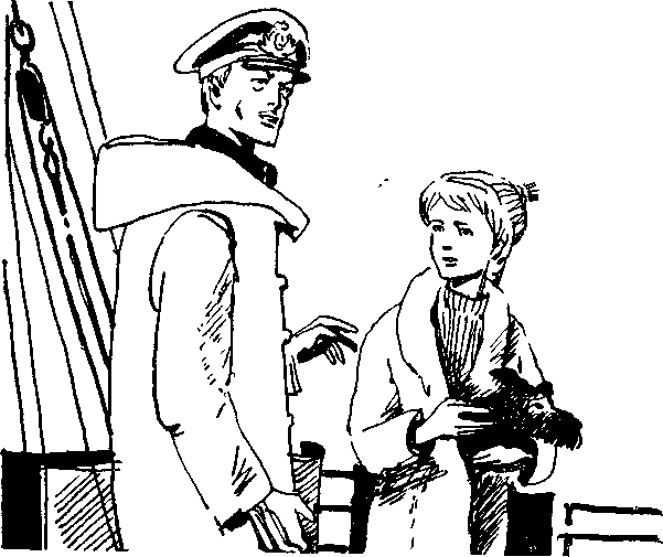Этот старик, мистер Мэтью, как узнала позже Антошка, много лет служил стюардом на пассажирских пароходах и будил своей музыкальной шкатулкой богатых путешественников, приглашая их к столу. Во время войны он перешел на транспортный пароход помощником боцмана вместе со своей шкатулкой. Матросы любили слушать шотландские песенки, и в кубрике шкатулка Мэтью была единственным музыкальным инструментом. Оторванные на многие недели от дома, всегда в напряжении, они прислушивались к музыке, обещавшей им скорую встречу с семьей, землей и, главное, мирную жизнь, и готовы были без конца слушать волшебную шкатулку. Антошка шепнула Пикквику, чтобы он тихонько сидел в каюте и не скулил. Следом за мистером Мэтью они с мамой поднялись на верхнюю палубу, на которой воцарилась тишина — время ленча, — и прошли в кают-компанию. За столом уже собралось человек десять. Все они при входе женщин встали, и капитан указал Елизавете Карповне и Антошке места рядом с собой. — Господа, — сказал капитан, — я представляю вам наших милых пассажиров: миссис доктор Элизабет Васильефф, мисс Анточка Васильефф и… — Капитан обвел глазами каюту. — А где же третий пассажир? — спросил он Антошку. — Я его оставила внизу, — виновато пролепетала она. — О, прошу мистера Пикквика пригласить к столу. А впрочем, мы попросим это сделать Гарри. На противоположном конце стола поднялся молодой матрос.