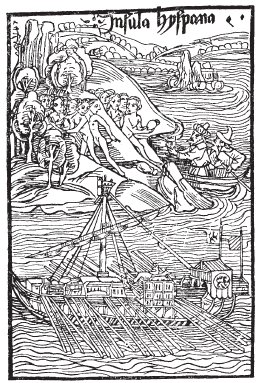Совершив первое пересечение Карибского моря, адмирал прибыл 20 августа 1498 г. на Эспаньолу и застал там полный развал. Идальго отказались признавать власть начальников, назначенных Колумбом. Они восстали с оружием в руках против его брата Бартоломео; для потехи превращали индейцев в мишени для стрел, изнуряли своих новых «подданных» работой на плантациях, держали десятки рабов для рыбной ловли и охоты, для переноски себя в гамаках, а рабынь – «для домашних услуг». Они жили с захваченными ими насильно индианками «в наглом многобрачии». Мятеж закончился унизительным для Колумба соглашением. Каждому мятежнику был отведён большой участок земли, к которому для обработки было прикреплено определённое число индейцев. Так Колумб санкционировал широкое распространение той характерной для начального периода испанской колонизации системы закрепощения индейцев, которая получила название репартимьенто (буквально – «распределение», «раздел»). За побег по усмотрению владельца полагалась смертная казнь или обращение в рабство. Королевская казна продолжала получать ничтожные доходы от новой колонии. А в это время португалец Васко да Гама обнаружил морской путь в подлинную Индию (1498 г.), завязал с ней торговлю и вернулся на родину с грузом пряностей (1499 г.). Земли, открытые Колумбом, – теперь это было уже очевидно – не имели ничего общего с богатой Индией. Сам Колумб казался болтуном и обманщиком. На него посыпались новые доносы, обвинения в утайке королевских доходов. Из Эспаньолы поступали сведения о мятежах и казнях дворян. Идальго, вернувшиеся ни с чем на родину из Колумбовой Индии, обвиняли адмирала, открывшего «страну обмана и несчастий, кладбище кастильских дворян». Они свистками и бранью преследовали сыновей адмирала – пажей королевы. В 1499 г. короли отменили монополию Колумба на открытие новых земель, чем немедленно воспользовалась часть его спутников, ставших его соперниками. А в 1500 г. на Эспаньолу с неограниченными полномочиями отправился Франсиско Бовадилья [27] . Адмирал должен был сдать ему все крепости, корабли, лошадей, оружие и запасы. Бовадилья захватил в руки всю власть, поселился в доме Колумба, завладел его вещами и документами, его деньгами, выплатил всем колонистам задержанное жалованье. Он стал всеобщим любимцем, когда разрешил каждому испанцу добывать золото в течение 20 лет, с уплатой в казну лишь седьмой части добычи (вместо прежней трети). Он арестовал адмирала, его братьев Бартоломео и Диего и заковал их в кандалы. После двухмесячного следствия Бовадилья пришёл к выводу, что Колумб был человек «жестокосердный и неспособный управлять страной», и отправил трёх братьев в кандалах в Испанию. В октябре 1500 г. корабль вошёл в гавань Кадиса. Однако заинтересованные влиятельные финансисты сумели «мобилизовать общественное мнение» в пользу разжалованного и униженного адмирала моря-океана. Короли приказали освободить его, письменно выразили ему своё сочувствие, лицемерно негодовали против недостойного обращения с ним, приказали выдать ему 2 тыс. золотых, чтобы он мог явиться ко двору «в приличном виде», обещали восстановить в правах, но не выполнили этого [28] . Вероятно, после освобождения Б. Колумб составил чертёж, иллюстрирующий представления X. Колумба о «взаимоотношении» Старого и Нового Света.Массовая колонизация