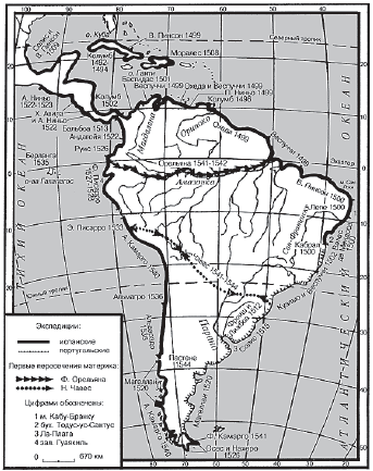 Католическая церковь, не желая отставать от светских властей, также решила проявить интерес к Магелланову проливу. В конце 1536 г. епископ одного маленького испанского городка получил патент на «завоевание и заселение» берегов Тихого океана от Перу до Магелланова пролива. Снаряженные им три корабля [153] вышли из устья Гвадалквивира в августе 1539 г. После захода в один или два бразильских порта флотилия прошла за 52° ю. ш. и в середине января 1540 г. бросила якорь близ входа в Магелланов пролив. 22 января 1540 г. флагман, борясь с западным штормом, наскочил на мель и затонул; большая часть команды спаслась и перешла на корабль, которым командовал Алонсо Камарго. Он благополучно прошёл проливом в Тихий океан и, повернув на север, проследил западное побережье Южной Америки на протяжении около 5000 [154] км до порта Кальяо (12° ю. ш.), куда прибыл в начале 1541 г. Во время плавания А. Камарго ни разу не терял из вида берег материка. Для увековечения этого достижения команда доставила судно, имевшее жалкий вид, в город Лиму и установила его у вице-королевского дворца как памятник. Третий корабль под командой Франсиско Камарго, неизвестно почему потеряв много времени, остался зимовать у Огненной Земли. Антарктическим летом 1541 г. испанцы впервые проследили всё (около 400 км) восточное побережье острова и, как считают аргентинские историки открытий, прошли на запад проливом, позже названным именем Ле-Мера. Не исключено, что они «заглянули» и в пролив Бигл (у 55° ю. ш.). После возвращения в Атлантику Ф. Камарго обнаружил «восемь или более островов» (Фолклендские или Мальвинские?) и 30 декабря 1541 г. благополучно прибыл на родину.Поиски легендарных стран в бассейне Амазонки во второй половине XVI в.