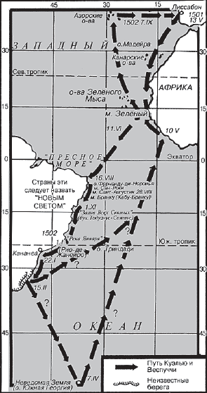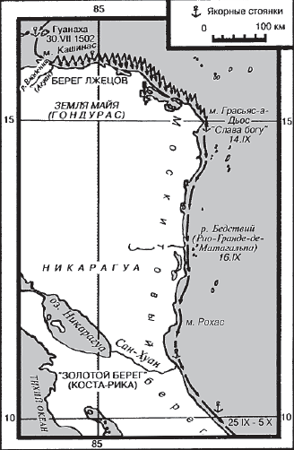 Западнее он обнаружил невысокий и узкий остров Аруба, с жилищами на сваях. Люди Охеды, применив оружие, ворвались в дома, захватили много раскрашенной одежды из хлопка и без потерь вернулись на суда. Многолюдный посёлок на воде, состоявший из таких же свайных построек, они увидели и на холмистом полуострове Парагуана, северный мыс которого Охеда и Веспуччи окрестили Кабо-де-Сан-Роман – в честь святого (9 августа 1499 г.), это имя в несколько сокращённой форме мыс у 70° з. д. носит и ныне. Обширный залив к западу Охеда назвал Венесуэла – в честь «царицы Адриатики» (по-испански Венесуэла значит «маленькая Венеция», название позже распространилось на весь южный берег Карибского моря до дельты Ориноко включительно). Флотилия прошла по заливу на юго-запад и через узкий пролив 24 августа проникла в другой залив – маленькую лагуну Св. Бартоломе (Маракайбо). На его берегах – в «стране Кокибакоа» – моряки, по словам хронистов, захватили или выменяли нескольких очень привлекательных девушек. По выходе из лагуны испанцы обогнули открытый ими полуостров Гуахира и около 1 сентября у мыса Ла-Вела (72°10′ з. д.) повернули к Эспаньоле, куда прибыли 5 сентября 1499 г. Почти за два месяца плавания от Гвианы до Гуахиры Охеда открыл более 3 тыс. км побережья, но при этом обследовал лишь часть северного берега неведомой суши: его люди видели, что она простирается далее и на юго-восток, и на запад. Такая земля могла быть только материком. И первым сделал этот вывод, видимо, ла Коса, с которым в конце сентября беседовали спутники Колумба. На составленной ла Косой карте [32] побережья крайний пункт, достигнутый испанцами, показан далеко к западу от мыса Ла-Вела и носит имя Св. Евфимии, чей день по католическим святцам приходится на 16 сентября, т. е. на полмесяца позже отплытия Охеды к Эспаньоле. Вероятное объяснение этого «казуса» приводится в главе о плаваниях Веспуччи (гл. 9). По пути домой моряки Охеды совершили разбойничий набег на Багамские острова и захватили более 200 индейцев. Экспедиция вернулась в Испанию в июне 1500 г. Золота и жемчуга Охеда привёз с собой очень мало, но всё-таки после продажи живого товара на каждого участника предприятия пришлось в среднем по 10 золотых. Вскоре после Охеды разрешение на открытия на Западе получил штурман Педро Алонсо (Пералонсо) Ниньо, участник трёх экспедиций Колумба. Средства для снаряжения небольшого судна (около 50 т) с командой в 33 человека дал ему севильский банкир Луис Герра при условии, что капитаном будет его брат Кристоваль Герра, и братья, конечно, выговорили себе львиную долю добычи. Они отплыли в начале июня 1499 г., а уже в начале июля судно прошло через Пасть змеи в залив Пария и наткнулось на 18 лодок с индейцами, осыпавшими испанцев стрелами. П. Ниньо достиг полуострова Пария и на плоском берегу запасся грузом бразильского дерева. Через Пасти дракона он вышел в Карибское море и первым ступил на остров Маргарита, где закупил очень много жемчуга. Затем испанцы обогнули полуостров Арая, завершив его открытие, высадились на материк и в августе обнаружили залив Карьяко. Успешные торговые операции продолжались в сентябре и октябре; за это время моряки проследовали на запад вдоль берега, получившего название Жемчужного благодаря богатому «урожаю» жемчуга, собранному ими. Ниньо выяснил, что западнее лежит страна, где можно доста
