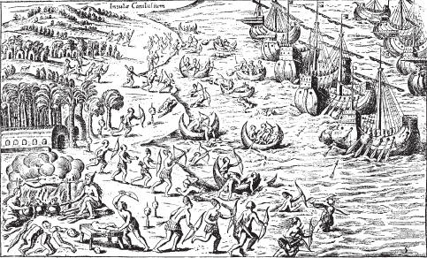 4 ноября Колумб направился к наибольшему из них, названному Гваделупой. Там испанцы провели восемь дней, много раз высаживались на берег, осматривали селения, заходили в жилища. «В домах мы нашли множество человеческих костей и черепов, развешенных, точно посуда, для разных надобностей. Мужчин мы видели здесь немного: как нам объяснили женщины, большая часть их ушла на десятках каноэ грабить… острова. Люди эти нам показались более развитыми, чем обитатели других островов… Хоть у них и соломенные жилища, но построены они добротнее… в них больше утвари… У них много хлопка… и немало покрывал из хлопчатой ткани, выработанных так хорошо, что они ничуть не уступают нашим кастильским» – так врач экспедиции Диего Альварес Чанка охарактеризовал быт индейцев в письме своему знакомому. По словам пленниц, на всех трёх новооткрытых островах жили карибы. Они совершали нападения на земли мирных, почти безоружных араваков, делая далёкие переходы на больших челнах-однодеревках. Оружием их были луки и стрелы с наконечниками из обломков черепаховых панцирей или «из зазубренных рыбьих костей, похожих на острые пилы». «Совершая набеги… карибы увозят с собой женщин, сколько могут захватить, чтобы сожительствовать с ними… или держать их в услужении. Женщин… так много, что в 50 домах мы видели одних только индианок [15] … Женщины эти говорят, что карибы… детей, рождающихся у этих женщин… пожирают, а воспитывают только тех, кто прижит от жён-карибок. Пленных мужчин они увозят в свои селения и съедают их там, и точно так же они поступают с убитыми» (Д. Чанка). «Кариб», искажённое испанцами в «каннибал», вскоре стало синонимом слова «людоед». Обвинение карибов в людоедстве, как видно из «дневника» Колумба и письма Чанки, основаны были на сообщениях жителей Эспаньолы и пленниц с Малых Антильских островов и как будто бы подтверждались находками в карибских жилищах человеческих черепов и костей. Однако сам Чанка вскоре усомнился в том, что это доказательство людоедства – черепа были и в жилищах мирных араваков: «Мы нашли на Эспаньоле в корзинке, сплетённой очень красиво и тщательно, хорошо сохранившуюся человеческую голову. Мы решили, что это голова отца, матери или другой особы, чью память здесь очень чтут. Впоследствии я слышал, что таких голов находили великое множество, и потому считаю, что мы правильно судим об этом». Что касается показаний араваков, страдавших от набегов карибов, то даже некоторые западно-европейские историки и этнографы XIX в. не считали такие свидетельства заслуживающими безусловного доверия. Они подчёркивали, что колонизаторы в своих сообщениях сознательно преувеличивали кровожадность карибов, чтобы оправдать массовое обращение в рабство или истребление жителей Малых Антильских островов. Российские этнографы допускают, что у карибов, как и у других народов, в период перехода от матриархата к патриархату существовало людоедство как военный обычай: они верили, что отвага, сила, быстрота и прочие воинские доблести врага перейдут к тому, кто съест его сердце или мышцы рук и ног. От Гваделупы Колумб двинулся на северо-запад, открывая один остров за другим: 11 ноября – Монтсеррат, Антигуа (испанцы там не высаживались) и Невис, где суда стали на якорь; 12 ноября – Сент-Кристофер, Синт-Эстатиус и Саба, а 14 ноября – Санта-Крус (на западе), 