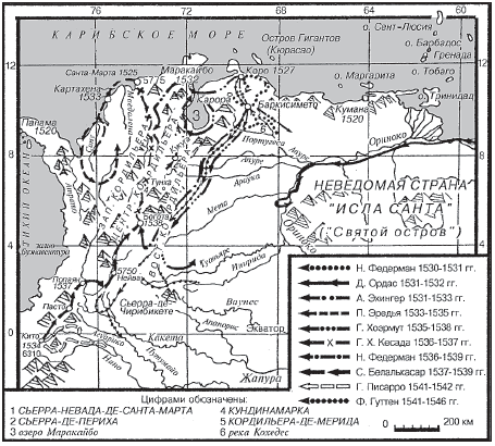 Разрешение на новые открытия в западной полосе Атлантического океана первым в Испании получил Алонсо Охеда, участник второго плавания Колумба. Этот красивый, жестокий и жадный человек смог снарядить лишь одно судно, средства для экипировки двух других кораблей ему дали флорентийские банкиры. Этим, видимо, объясняется, что с ним отправился приказчик банкирской конторы флорентиец Америго Веспуччи; приглашены также были Хуан ла Коса и другие участники второго плавания Колумба. Сам Охеда видел карту залива Пария и Жемчужного берега, посланную Колумбом королям в 1498 г. Экспедиция вышла из Кадиса 18 мая 1499 г., где-то в пути Охеда захватил каравеллу, и часть её команды согласилась идти с ним. Уже в конце июня четыре корабля достигли нового материка у 6° или 5° с. ш., а может быть у 4° (бухта Ояпок, 51° з. д.), и здесь разделились. Веспуччи на двух судах остался (см. гл. 9), а Охеда на двух других двинулся к западо-северо-западу. Нигде не высаживаясь, он проследил 1200 км побережья Гвианы [30] и Венесуэлы до дельты Ориноко и вышел через открытые Колумбом проливы в Карибское море. Переход отнял столько времени, что Охеда следовал вдоль Жемчужного берега на две-три недели после Педро Ниньо, о чём оба не знали. Это обстоятельство сильно отразилось на финансовых результатах экспедиции Охеды: где его предшественники получали груды жемчуга, он собрал несколько жемчужин. Близ мыса Кодера суда Охеды и Веспуччи соединились. За мысом Кодера тянулись сначала плоские, а на протяжении 200 км далее к западу гористые, никем ещё не разведанные берега – Охеда и Веспуччи открыли восточную часть Карибских Анд. Страну населяли «негостеприимные» индейцы гуяно, которые, как правило, отказывались давать золото и жемчуг в обмен на европейские «товары», из-за чего часто происходили стычки. Одна из них у приморского селения с забавным названием Чичиривиче (у 68°20′ з. д.) едва не стала последней в жизни высадившихся испанцев: индейцев оказалось так много, что пришельцы дрогнули. Но 5 5-летний ветеран повёл их за собой – туземцы не выдержали натиска и рассеялись, оставив 150 убитых. Потери испанцев: один убитый и 22 раненых. В ожидании, пока они поправятся, Охеда простоял здесь 20 дней, а затем продвинулся к северу и открыл холмистый Остров Гигантов [31] , населённый рослыми индейцами и богатый бразильским деревом.
