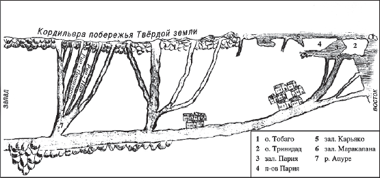 2 августа с востока к мысу подошёл большой челн с 24 воинами с Тринидада. «Они были молоды и хорошо сложены, кожей не черны, белее всех, кого я видел в Индиях, стройны и телом красивы. Волосы у них длинные и мягкие, остриженные по кастильскому обычаю, а головы повязаны платками из хорошо обработанной разноцветной хлопчатой пряжи… Некоторые были опоясаны этими платками… У меня не было ничего, что могло бы… побудить их подойти к кораблям. Поэтому я распорядился вынести… тамбурин и приказал молодым матросам плясать… Но как только они услышали музыку и увидели танцующих, все они оставили весла, взяли в руки луки и… принялись осыпать нас стрелам [25] … и я приказал разрядить по ним арбалеты. Они отплыли…» При попутном ветре суда прошли пролив, наречённый адмиралом Бока-де-ла-Сьерпе («Пасть змеи»). К северу от него воды были спокойны. Случайно зачерпнув воду, Колумб обнаружил, что она пресная. Он плыл на север, пока не достиг высокой горы (Патао – 1010 м) на востоке гористого полуострова Пария, отделяющего залив Пария от Карибского моря. «Там пролив сделался очень узким… и течение также шло в двух направлениях, и вода бурлила с такой же силой, как и у берегов Песчаного мыса. И точно так же вода в море была пресная». Этот северный пролив был назван Бокас-дель-Драгон («Пасти дракона»). Чем дальше на запад двигался Колумб вдоль южного берега Земли Грасия (полуострова Пария), тем всё более пресной становилась вода. На побережье росло много незнакомых испанцам фруктовых деревьев, на их ветвях резвилась масса обезьян. Испанцев удивляли мангровые заросли, поднимавшиеся прямо из моря. Там, где полуостров расширяется, а горы отступают к северу, суда бросили якорь. «Туземцы… стали подходить к кораблям на бесчисленном множестве каноэ, и у многих висели на груди большие куски золота, а у некоторых к рукам были привязаны жемчужины… Они сказали мне, что жемчуг добывается здесь, именно в северной части этой земли». Высадившихся испанцев индейцы приняли очень радушно. Адмирал полагал, что Грасия – остров, но напрасно искал выхода из залива в западном направлении, следуя вдоль его берегов. А море стало уже опасно мелким. И адмирал направил самое маленькое из своих трёх судов – каравеллу «Коррее» – дальше на запад; там оказался тупик. Тогда испанцы пошли на юго-юго-восток вдоль побережья, мимо трёх бухт «средней величины» – устьев рек Амана, Сан-Хуан и Гуанипа – и достигли четвёртой, в которую «впадала огромная река. Глубина в ней была пять локтей, вода пресная, и текла она в огромном количестве». Судя по описанию, они открыли западный рукав дельты Ориноко. Так разъяснились те странные явления, которые наблюдал адмирал, – водовороты в проливах от встречи морских течений с потоками речной воды, пресная вода в заливе. Зато возникло другое тяжёлое недоумение: где и как могла образоваться такая могучая река? Болезнь и порча припасов не позволяли Колумбу оставаться дольше у берегов этой странной земли, которую он сначала окрестил Грасия, а потом изменил название на Земля Пария. Адмирал решил скорее добраться до Санто-Доминго. Воспользовавшись попутным ветром, 12 августа он благополучно вывел свои суда через Пасти Дракона в открытое море. После поворота на запад он шёл два дня «вдоль высокой, очень красивой земли» – северного побережья полуострова Пария. К северу (
