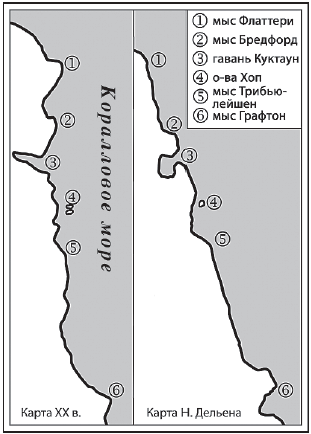 Береговая черта Австралии на картах XX в. и Н. Дельена (по К. Мак Интайру, упрощено)