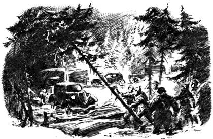 Оперативные сводки скупо говорили о том, что продвижение замедляется, так как войска вынуждены прокладывать себе дороги по болотистым лесам. Вслед за войсками по зыбким, дрожащим под ногою, не замерзшим, но уже покрытым снегом финским болотам двигалась группа водителей со своими автомобилями. Водители рубили елки, укладывая их сплошным настилом, и по этому настилу проводили свои машины. Они убирали с пути огромные валуны, оставленные здесь древними ледниками, они прорубались сквозь частый лес… Им нужно было поспевать за своей частью. Стояли морозы, но люди работали без шинелей и ватников. Им было жарко. Работали дружно. За четыре часа караван грузовиков с боеприпасами, продовольствием и оружием продвигался вперед метров на триста. Среди многих автомобилей в колонне шла и зеленая «эмка» — машина командира полка. Ее вел двадцатитрехлетний шофер Анатолий Григорьевич Койда. Вместе с товарищами он не жалел сил: валил деревья, настилал дорогу, стремясь скорее туда, где уже дралась пехота. Так за трое суток, шаг за шагом, были пройдены по болотам тридцать километров пути. Следующим колоннам проход был открыт. Полк наступал, и вместе с командиром полка неотлучно по самым плохим дорогам следовал шофер Койда. Он прятал свою машину в лесной чаще и шел вперед вслед за командиром на огневые позиции. Высокий, стройный, с резким профилем и немного запавшими глазами, всегда веселый, находчивый, с украинской шуткой на устах, он жаждал боя. И он дождался его! В ту ночь полк занимал позиции у реки. В глубине леса, у дымных костров, пламя которых закрывали от чужого взгляда шалаши из ельника, расположились бойцы. В ту ночь командир сказал: — Койда, иди ночевать к писарям, на хутор. На хуторе было три дома: большой, многокомнатный, с широкими окнами, стоявший особняком на горе, и в отдалении два маленьких домика — службы. Люди тесно расположились в двух маленьких постройках. Большой дом командир запретил занимать. В три часа ночи, по тревоге, Койда проснулся, вскочил на ноги. Где-то близко шла перестрелка. Не найдя в темноте шлема, он вышел с пистолетом в руке на порог. Прямо перед ним длинная просека прорезала ночной лес.