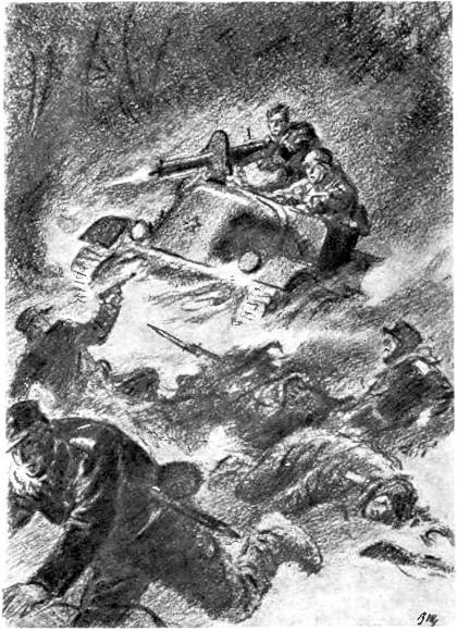 Через минуту, нагруженный цинковыми ящиками с патронами, пулеметными лентами и дисками, трактор уже мчался по лесной извилистой дороге, громыхая на ухабах. Койда мчался к заставе. Противник ускользал от него за поворотами дороги, разбегался по лесу и, припадая за деревьями, бил огнем. Пули стучали по металлу мчащегося трактора. — Я ранен! — воскликнул водитель. — Можешь вести машину? Гони! — повелительно отозвался Койда и почувствовал, как по руке потекла горячая липкая кровь: он тоже был ранен. — Потом разберемся! — крикнул он снова водителю. Наконец тягач домчался до заставы. Бойцы лежали в снегу и не отстреливались. Патроны иссякли. Все теснее сжималось вражеское кольцо вокруг заставы. Трактор Койды, как вихрь, прорвался к своим. В первую минуту бойцы подумали, что это белофинский танк — настолько неожиданным было его появление. Койда поднялся и громко позвал: — Товарищ Колесник! Начальник заставы подбежал к машине. — Койда, это ты? — удивился он. — Куда мне стрелять? Где противник? — торопился Койда. — Стреляй кругом! — последовал ответ. — Давай гони на одной гусенице! — не раздумывая ни секунды, сказал Койда водителю. Тот понимал его с полуслова. Он мгновенно оттянул рычаг правого тормоза, и тягач волчком завертелся на одной гусенице. И так он вращался двадцать минут, и в течение этих двадцати минут Койда длинными очередями строчил по врагу во все стороны через головы лежащих бойцов…
