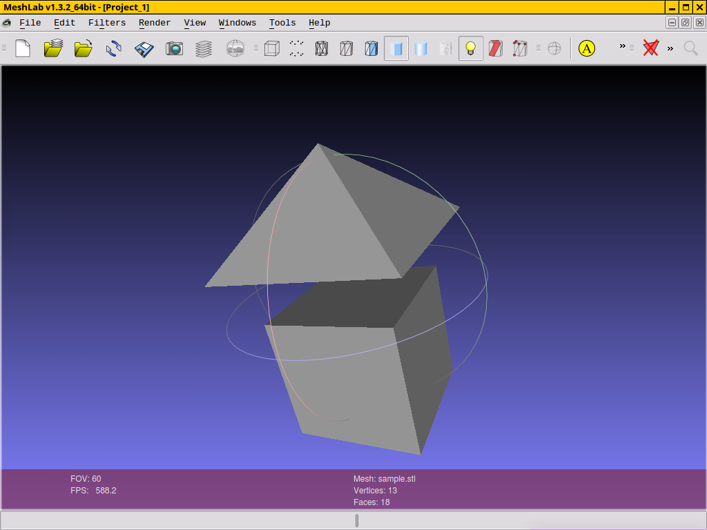 Сделаем рендер и экспортируем файл в STL. Откроем STL с помощью meshlab (точнее, импортируем в новый пустой проект). Это не wings, и он прекрасно читает этот меш.