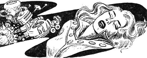 Медлана казалась удивленной. — Разумеется, нет. Мы используем роботов. Реакции нормальных людей, таких, как вы, занимают несколько десятых долей секунды, у наших врагов это составляет несколько сотых долей, а реакция электронных мозгов, которые управляют роботами, приблизительно равна миллионной доле секунды. Они действуют неизмеримо быстрее, чем любой человек. Это — одна из причин, по которой мы не боимся врагов. — А другие причины? — Разве они не очевидны? Враги расходуют запасы еды и воздуха в десять раз больше, чем мы. Ни один из их кораблей не сможет долететь даже до Марса, если у них на борту не будет обыкновенной человеческой команды и только один-два члена группы Р, чтобы управлять ими. Иначе скорость потребления продовольствия и воздуха была бы слишком высока. А у тех боевых кораблей наверняка больше одного-двух людей Р на борту. — И это означает, что скоро им придется возвращаться, в то время как мы полетим дальше на Марс. — Я вовсе не говорила, что нашей целью является Марс, — спокойно заметила Медлана. Коррелл был поражен. — Мы летим не на Марс? Но куда же? Она пожала плечами. — Скоро вы все узнаете. Сейчас мне придется вас оставить. Я должна сделать отчет. Коррелл преградил ей путь. — Я был дураком… — Несомненно, — согласилась Медлана. — Мы уже оказывались в подобной ситуации. Нас зарегистрировали, как мужа и жену, а у меня даже не возникло мысли поцеловать вас на прощание, когда вы уезжали. Загадочное выражение ее лица ничего не сказало. — По-моему, — улыбнулась девушка, — я пропустила это место в своем предыдущем докладе начальству. — Ну, я не повторяю одну и ту же ошибку дважды, — заявил Коррелл. — Можете так и записать в своем отчете. — И обнял ее. Она не сделала попытки сопротивляться. Вместо этого, Коррелл почувствовал, как она обняла его в ответ. Он не знал, сколько прошло времени, прежде чем сзади раздался резкий голос: — Медлана! Коррелл обернулся. В двери застыл бородатый Арвон, и над густой бородой сверкали ненавистью его глаза. И вовсе нет в них никакого загадочного выражения, подумал Коррелл. Его глаза пылали яростью, происхождение которой трудно было не понять. Медлана медленно отошла в сторону, на ее лице было все то же загадочное выражение, когда она пробормотала: — Прости, Арвон. Я… невольно… задержалась. Она пошла к дверям, и Корреллу на мгновение показалась, что в уголках губ, которые он только что целовал, слабо подрагивает улыбка. Желто-зеленое облако теряло яркость, бледнея и уменьшаясь. Теперь сквозь него проглядывались звезды и сверкающие точки ракетных двигателей, проносящиеся мимо иллюминатора. Коррелл увидел, что они теряют скорость, движение их становится все медленнее и медленнее, пока они не поползли в темпе улитки. Сперва Коррелл подумал, что судно притормаживает. Но затем понял, что это ослабевает действие препарата. Теперь он стал реагировать, как обычно, и мир не мчался мимо него в бешеном темпе. Но для Медланы время продолжало тянуться так же медленно, как и всегда.