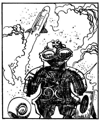 Закусочная стояла на острове V-образной развилки, от которой дорога шла в двух разных направлениях. В призрачной предрассветной мгле красная вывеска над крышей казалась розовой. Прихрамывая, Блейк ускорил шаг. Здесь можно было отдохнуть, обогреться и перекусить. Бутерброды, которыми снабдила его Элин, помогли ему прошагать без остановки всю ночь, но теперь он снова проголодался. Когда наступит утро, он должен найти какое-нибудь местечко, где можно и укрыться, и отоспаться. Может быть стог сена. Интересно, думал он, остались ли еще стога сена, или даже такие простые веши, как стога, уже исчезли с лица Земли с тех пор, когда он ее знал? Северный ветер яростно хлестал его, и Блейк натянул капюшон накидки налицо. Бечевка мешка натирала плечо, и он попытался устроить его поудобнее, отыскать еще не натертый клочок кожи. Наконец он добрался до забегаловки, пересек стоянку перед входом и поднялся по короткой лестнице к двери. В закусочной было пусто. Поблескивала отполированная стойка, в свете рядком протянувшихся по потолку ламп ярко сиял хром кофейника. — Как поживаете? — спросила Закусочная голосом храброй и бойкой официантки. — Чего бы вы хотели на завтрак? Блейк огляделся, но никого не увидел и только тогда оценил положение. Еще одно здание-робот, наподобие летающих домов. Протопав по полу, он уселся на один из табуретов. — Оладьи, — сказал он, — немного ветчины и кофе. Он высвободил плечо из лямки и опустил мешок на пол рядом с табуретом. — Рано утречком на прогулочку? — спросила Закусочная. — Только не говорите мне, будто шагали всю ночь напролет. — Нет, не шагал, — ответил Блейк. — Просто рано встал. — Что-то вас, парни, последнее время совсем не видно, — заявила Закусочная. — Чем вы занимаетесь, приятель? — Пописываю, — ответил Блейк. — Во всяком случае, пытаюсь. — Ну что ж, — рассудила Закусочная, — так хоть страну посмотришь. А я-то все тут торчу и никогда ничего не вижу. Только разговоры слушаю. Но не подумайте, что мне это не нравится, — торопливо добавила она. — Хоть мозги чем-то заняты. Из патрубка на сковородку с ручкой выпал ком теста, потом горловина передвинулась вдоль канавки, выпустила еще два комка и со щелчком вернулась на место. Металлическая рука, прикрепленная рядом с кофейником, разогнулась, вытянулась и передвинула рычаг над сковородой. Три ломтя ветчины скользнули на сковородку, рука ловко опустилась и отделила их один от другого, уложив ровным радом. — Кофе сейчас подать? — спросила Закусочная. — Если можно, — ответил Блейк. Металлическая рука схватила чашку, поднесла к носику кофейника и подняла вверх, включая патрубок. Потек кофе, чашка наполнилась, рука повернулась и установила ее перед Блейком, затем нырнула под прилавок, достала ложку и вежливо пододвинула поближе сахарницу. — Сливок? — спросила Закусочная. — Нет, спасибо, — ответил Блейк. — Позавчера такую историю слыхала — закачаешься, — сказала Закусочная. — Один парень заходил, рассказывал. Похоже что… За спиной у Блейка открылась дверь. — Нет! Нет! — закричала Закусочная. — Убирайся вон. Сколько раз тебе говорить: не входи, когда у меня посетители. — Я и зашел, чтобы встретиться с твоим посетителем, — ответил скрипучий голосок. Услышав его, Блейк резко обернулся. В дверях стоял Брауни; его маленькие глаза поблескивали на мышиной мордочке, по бокам куполооб