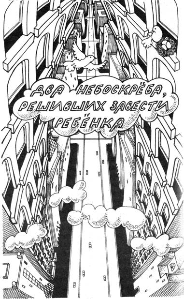 На одной из улиц Печенка-с-луком-сити стояли друг против друга два небоскреба. Днем, когда улицы были полны продающего и покупающего народа, они разговаривали друг с другом так, как разговаривают горы. Ночью, когда все продающие и покупающие отправлялись по домам, а на улице оставались только полицейские и таксисты, ночью, когда по улицам полз туман, набрасывая на дома фиолетово-серое покрывало, ночью, когда звезды и небо укутывали город пеленой фиолетово-серого тумана, два небоскреба склонялись друг к другу и шептались. Что они шептали друг другу – тайны или что-то такое простое, что известно и мне и тебе и всбм остальным – это осталось их тайной. Одно можно сказать наверняка – часто можно было увидеть, как они по ночам склоняются друг к другу и шепчутся, точно так же, как по ночам склоняются друг к другу и шепчутся горы. Высоко, прямо на крыше одного из небоскребов стояла бронзовая коза, она смотрела вдаль на бескрайнюю прерию, где серебристо-голубые озера сверкали как голубые фарфоровые тарелки, и в утреннем солнце сияли змейки рек. Высоко на крыше другого небоскреба стоял бронзовый гусь, он смотрел вдаль на бескрайнюю прерию, где серебристо-голубые озера сверкали как голубые фарфоровые тарелки, и в утреннем солнце сияли серебристые змейки рек. У двух небоскребов был друг – Северозападный Ветер. Он прилетал издалека, за пару часов покрывая пять сотен миль. Он двигался так быстро, а небоскребы все стояли неподвижно на том же самом углу той же самой старой улицы, потому-то он всегда приносил им новости. «Я вижу, город все еще на месте», – насвистывал ветер небоскребам. А они в ответ: «Да, а горы все еще там, откуда ты прилетел, Ветер?» «Горы еще там, а за ними – море, и железная дорога бежит, спешит по прерии к горам и к морю», – отвечал Северозападный Ветер. Теперь я расскажу о том, что Северозападный Ветер пообещал двум небоскребам. Он часто тряс бронзовую козу и бронзового гуся, стоящих на крышах небоскребов. «Ты что, хочешь сдуть бронзовую козу с моей крыши?» – спрашивал один небоскреб. «Ты что, хочешь сдуть бронзового гуся с моей крыши?» – спрашивал другой. «Нет, нет, – Северозападный Ветер улыбался сначала одному, потом другому небоскребу. – Если я сдую козу, если я сдую гуся, то только из жалости к вам, когда на вас обрушится несчастье – чьи-то похороны». Время шло, а небоскребы стояли себе среди полицейских и таксистов, среди продавцов и покупателей, нагруженных свертками, пакетами и узлами, и высоко-высоко на крыше стояли коза и гусь, сюяли и глядели на серебристо-голубые озера, похожие на голубые фарфоровые тарелки, на серебристые змейки рек, извивающиеся под утренним солнцем. Время шло, Северозападный Ветер прилетал, рассказывал новости и повторял свое обещание. Время шло, и небоскребы решили завести ребенка. А еще они решили, что когда их ребенок родится, он станет свободным. «Он должен быть свободным, – повторяли они друг другу. – Он не должен всю жизнь смирно стоять на углу улицы. Да, да, если у нас будет ребенок, пусть он свободно носится по прерии, к горам и к морю. Да, да, он должен быть свободным». Время шло, ребенок появился на свет. Это был поезд Золотая Стрела, самый быстрый поезд, ходивший по самому длинному пути страны Рутамяты. Он мчался по прерии к горам и к морю. Два небоскреба были счастливы, они были так счастливы, что их сво