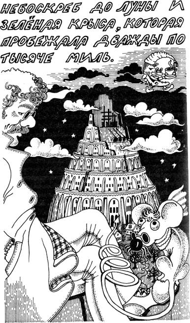 Мать Гулены Глазкинс шинковала овощи на рагу, и тут у нее сломался большой нож. Тогда Гулена взяла пятнадцать центов и отправилась в город покупать новый шинковальный нож для шинкования овощей. Выглянув из-за угла неподалеку от того места, где обычно устраивался со своим аккордеоном слепой Нос-Картошкой, она увидела старика, сидевшего нога на ногу, одна нога на тротуаре, другая болтается в воздухе. На той ноге, что болталась в воздухе, устроилась зеленая крыса, она завязывала старику шнурки ботинка на простые и двойные узлы. Старик вертел и качал ногой, и поэтому зеленая крыса тоже вертелась и качалась. Ее длинный хвост раз пять обернулся вокруг ботинка и под конец завязался красивым бантиком. От кончика носа до кончика хвоста по спине у крысы шла длинная белая полоска. Две других расположились над бровями. Еще пять, коротких и широких, играли в кошки-мышки за ушами и между ребрами. Старик и зеленая крыса беседовали об аллигаторах, о том, почему крокодилы всю зиму держат башмаки своих малюток в сундуках и зачем лунные крысы прячут перчатки в ледниках. «Год назад, прошлым летом, я подхватила ревматизм, – начала свой рассказ зеленая крыса. – У меня был такой страшный ревматизм, что мне пришлось пробежать тысячу миль на юго-запад до самого Куроградья, пока я не остановилась наконец в городе Верхние Куры». «Неужели?» – хмыкнул Нос-Картошкой. «Там, в Верхних Курах меня спросили, не знаю ли я, как остановить луну, и я ответила: «Конечно знаю, мне рассказал об этом крошка-крокодил, но я пообещала ему, что не проболтаюсь».