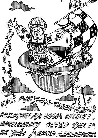 Жил-был в Крем-Торт-тауне один человек с лошадиной физиономией. Люди прозвали его Тощий Том Коняга. Худой он был, кожа да кости. Одна девчушка так сказала про него: «Его глаза как два светлячка, они вылезают из двух маленьких дверок и освещают летнюю ночь». Сняв шляпу с головы, он заводил руку за спину и вешал шляпу на острую торчащую лопатку. Собираясь надеть шляпу на голову, он заводил руку за спину и снимал шляпу с острой точащей лопатки. Как-то летом Тощий Том Коняга сказал Крошке Капризуле Хоч: «Я иду на север, я иду на запад страны Рутамяты, чтобы посмотреть, чем отличаются друг от друга разные города. Потом я поверну и пойду обратно, и сколько прошел на запад, пройду на восток, и сколько на север – пройду на юг, пока снова не вернусь туда, где живет в Крем-Торт-тауне мой маленький дружок, Крошка Капризуля Хоч». Он отправился в путь и шел на север и на запад, а потом возвращался на юг и на восток, пока не очутился снова в родном городке. Он уселся на пороге своей выкрашенной в красный цвет хибарки и стал ладить воздушного змея. «Ты рад, что вернулся назад?» – спросила Капризуля. «Конечно рад, здесь мой дом, и только тут я знаю, как поведет себя ветер, когда я скажу ему, что собираюсь запускать воздушного змея». «Расскажи мне, что ты видел и о ком слышал, и надавали ли тебе хорошеньких подарков». «Надавали, надавали, не беспокойся«, – ответил Тощий Том Коняга и продолжал: «Я шел и шел на запад и попал в Держи-Шляпинск. Там производят все шляпные булавки, которыми прикалывают шляпки по всей стране Рутамяте. Тамошние жители стали расспрашивать меня о Крем-Торт-тауне и о том, какие тут ветры, потому что здешние ветры уносят столько шляпок, что Держи-Шляпинск не успевает поставлять сюда булавки. В Держи-Шляпинске живет одна старушка. Она каждое утро и каждый вечер обходит весь город. За спиной у нее тряпичный мешок. Она никогда ничего не вынимает из мешка. Она никогда ничего не кладет в мешок. Вернее сказать, никто никогда не видел, чтобы она что-то клала или вынимала. Она никогда не открывает мешок, чтобы позвать прохожих посмотреть, что там есть. Она даже спит с мешком под подушкой. Он всегда с ней, и никто не может заглянуть в него без ее разрешения, а она никому не разрешает. Как ее зовут? Все называют ее Матушка-Тряпичница. На ней всегда передник с огромными карманами. Она никогда не разговаривает со взрослыми, но всегда рада повстречаться с мелким народцем, с мальчишками и девчонками. Ну, а больше всего она любит тех детишек, что повторяют: «Дяй» (один раз, как здесь) или «Дяй, дяй» (два раза, как здесь) или «Дяй, дяй, дяй» (три раза) или «Дяй, дяй, дяй, дяй, дяй, дяй» (столько раз, что и не сосчитаешь). Повстречав таких дяйдяек, она роется в карманах и достает оттуда шоколадку, кому квадратную, кому круглую, а кому шоколадку как полумесяц, а еще красно-белые сахарные палочки, леденцы, которых хватает на весь день, такие они длинные, и не только на весь день, но и на всю неделю и на следующую неделю тоже остается, и всякие биты и свайки, что звякают, падая на тротуар, так чудно клацают и звякают, когда их вывалишь на тротуар целой кучей. Иногда, когда кто-то из дяйдяек плачет и хнычет, она дает ему куколку величиной не больше ладошки, но эта куколка знает все буквы алфавита и может спеть коротенькую песенку по-китайски. Конечно, – продолжал Тощий Том Коняга, заводя руку за