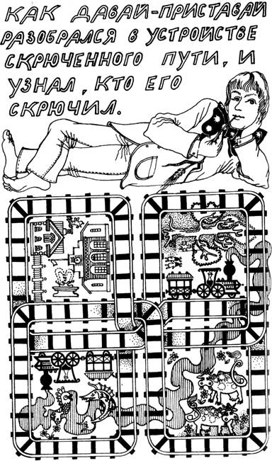 Однажды Давай-Приставай сказал сам себе: «Пойду, схожу на почту, посмотрю, что делается в мире. Может узнаю, не случилось ли чего интересного ночью, пока я спал. Может полицейский смеялся, смеялся, да и свалился в пруд, а оттуда вылез с пригоршней золотых рыбок, сверкающих, как драгоценные камни. Почем знать? Может лунный человечек спускался в подвал налить в кувшин сливок для своей женушки, чтобы она перестала плакать. Может, спускаясь по лестнице, он упал и разбил кувшин, засмеялся и собрал осколки, приговаривая: „Раз, два, три, четыре, несчастный случай в благородном семействе“. Почем знать?» Исполненный столь простых и приятных мыслей, Давай-Приставай вышел на задний двор и стал разглядывать выросшие на солнцепеке галстучные маки. Потом он сорвал один и на манер шейного платка повязал его, чтобы выйти в город на почту и поглядеть, что творится в мире. «Отлично придумано – чудно глядеться с платком вокруг шеи, чтобы глядеть, что есть чудного вокруг в мире, – сказал Давай-Приставай. – Что за платок у меня – с рисунком, зеленый в белый горошек, зеленый – точь-в-точь лягушка в лунном свете, а белые горохи – прямо как пятнышки на морде у пони». И он отправился в город и там первым делом повстречал слепого Носа-Картошкой, что играл на аккордеоне на углу у почты. Он попросил его рассказать, почему в стране Рутамяте железная дорога такая скрюченная. «Давным-давно, – начал слепой Нос-Картошкой, – задолго до того, как на заднем дворе начали расти галстучные маки, задолго до того, как появились такие галстучные маки, как твой, зеленые в горошек, зеленые – точь-в-точь лягушка в лунном свете, а белые горохи – прямо как пятнышки на морде у пони, в старину, когда прокладывали железную дорогу, она была совершенно прямой. А потом появились жуки-скрюки. У них скрюченное тельце на скрюченных ножках, они скрюченно грызут скрюченными зубами и скрю-ченно плюются скрюченными губами. Миллионы скрюков громко захрюкали в хрюкалки, что у них за ушами и под коленками. Они прыгнули на рельсы скрюченными ножками, и ну грызть скрюченными зубами, плеваться скрюченными языками, пока не скрутили всю железную дорогу. Все рельсы стали скрюченными, все шпалы стали скрюченными и все поезда, товарные и пассажирские, покатили по скрюченной дороге. Тогда жуки-скрюки уползли в поле и улеглись спать на специально скрюченных кроватях под специально скрюченными одеялами. На следующий день пришли копальщики с лопатами, катальщики с катками, и мальчишки-водоносы с ведрами и черпаками. Они носили рабочим воду, пока те выпрямляли дорогу. Еще я забыл сказать о лебедочниках с паровыми лебедками, которые тянули, тащили и выпрямляли дорогу. Они работали долго-долго, и дорога снова стала прямой. Они взглянули на свою работу и хором воскликнули: «Потрудились – сделали!» А наутро жуки-скрюки открыли скрюченные глаза и поглядели на шпалы и рельсы. Они увидели, что дорога снова выпрямилась, и прямыми стали все рельсы, и шпалы, и болты, и в то утро скрюкам было не до завтрака. Они выпрыгнули из скрюченных кроватей, они прыгнули скрюченными ножками на рельсы: и ну плеваться и грызть, пока снова не скрутили все рельсы, шпалы и болты. Только тогда скрюки отправились завтракать, и совсем как копальщики, катальщики и лебедочники, говорили хором: «Потрудились – сделали!» «Так вот в чем было дело – в жук