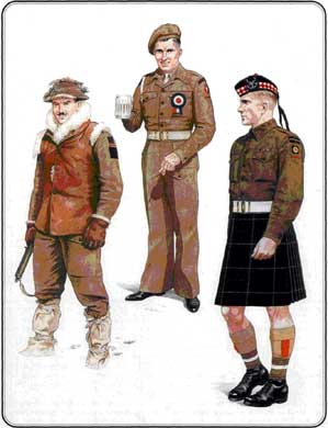 1. Когда в 1939 г. был издан приказ об унификации форменной одежды британских военнослужащих, полки шотландских хайлендеров не пожелали смириться с отменой традиционных килтов: офицеры продолжали приобретать их за свой счет. Сопротивление было настолько упорным, что в конце концов Военное министерство уступило и дало официальное разрешение на ношение килтов офицерам и уоррент-офицерам полков. Во время действий вне метрополии килты были «официально» запрещены, но на Британских островах волынщики и барабанщики могли надевать их. Для поддержания полковых традиций и морального духа многие части изыскивали возможности, чтобы хотя бы несколько солдат в полку были одеты в килты. Зимой 1944 г., когда 4-й батальон Собственного Его Величества Шотландского пограничного полка находился в Голландии, волынщик роты «С» Форд был сфотографирован в тартане клана Бакключ, в кильте, частично прикрытом чехлом. В последнюю зиму войны солдаты довольно часто надевали камуфлированные водоотталкивающие куртки поверх толстых свитеров. Основное снаряжение — образца 1937 г., с подтяжками вместо подсумков, снаряжением для пистолета (в данном случае — револьвер № 2 Enfild, калибра.38 дм), флягой и малым ранцем.