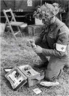 Нормандия, июнь — июль 1944 г.: сержант Дэвис проверяет укладки на полковом медпункте 4-го батальона Валлийских фузилеров, входящего в состав 158-й бригады 53-й (Уэльской) дивизии (специфика наплечных полковых лент этой части описана в комментариях к цветному рисунку Е). Этот пехотный унтер-офицер, получивший начальное медицинское образование, находился в подчинении батальонного офицера медслужбы и отвечал за комплектацию медпункта батальона и работу санитаров-носильщиков. Согласно организации медицинской службы в предвоенный период, санитары-носильщики выделялись из личного состава батальона или полка; они не входили в состав Королевского военного медицинского корпуса и обучались только навыкам оказания первой санитарной помощи, достаточной для того, чтобы поддержать раненого до момента доставки его на полковой медпункт (IWM B7571).