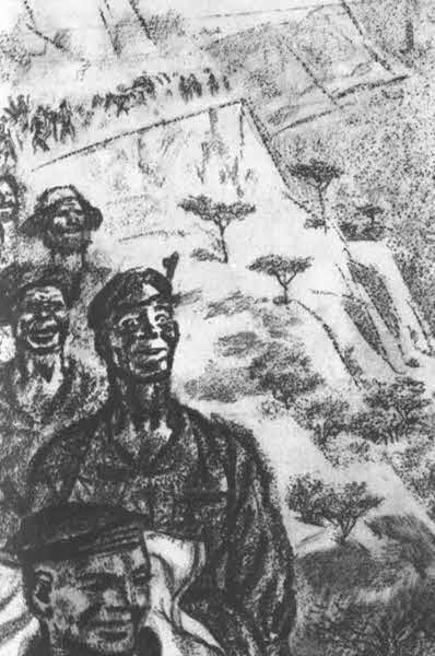 В бархатно-черном океане красновато шевелятся костры, озаряя лица, плоские, как из картона, фигуры, угол повозки, лошадиную морду. И вся ночь наполнена гомоном, голосами, восклицаниями, смехом; песни родятся близко и далеко, гаснут; зазвенит балалаечка; заиграет вперебивку гармоника. Костры, костры… Ночь полна еще чем-то, о чем не хочется думать. Над городом синевато озаренный свет электрического сияния. Заглядывает красноватый отсвет потрескивающего костра в старое лицо. Знакомое лицо. Э-э, будь здорова, бабуся! Бабо Горпино! Дид в сторонке лежит молча на тулупе. Кругом костра сидят солдатики, и лица красно озарены, — из своей же станицы. Котелки подвешены, да в котелках, почитай, вода одна. А баба Горпина: — Господи, царица небесная, що ж воно таке?! Йшлы, йшлы, йшлы, а ничого нэма, хочь подыхай, нэма чого пойисты. Що ж воно таке за начальство пожрать ничого не може дать? Якое же то начальство… Анки нэма. Дид мовчить. Вдоль шоссе неровная цепочка уходящих костров. За костром лежит на спине солдатик (его не видно), закинул за голову руки, смотрит в темное небо и не видит звезд. Не то вспомнить что-то хочется, не то тоска. Лежит, заломив руки, о чем-то о своем думает, и, как думы, плывет его голос — молодой, мягко-задумчивый:XXX