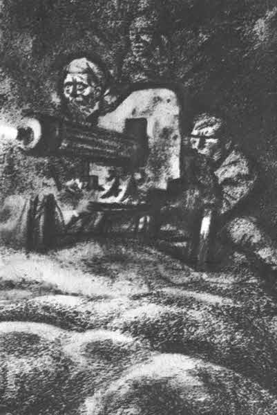 Пулемет в повозке засверкал. И как он послушен этому звериному глазу в этих перепутавшихся полосах черноты и дымно-лунных пятен, — ни одна пуля не задела, а только страшно зашевелил ветер смерти матросские фуражки. Все кинулись врассыпную. — Вот дьявол!.. Ну, и ловок!.. Таких бы пулеметчиков… На громадном пространстве спит лунно-задымленный лагерь. Спят задымленные горы. И через все море судорожно переливается дорога.