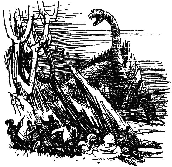 Послышалось шлепание босых ног. Зевая и почесывая волосатую грудь, на палубу вышел хозяин, Педро Зурита. Он был без рубашки, в одних холщовых штанах; на широком кожаном поясе висела кобура револьвера. Зурита подошел к людям. Фонарь осветил его заспанное, бронзовое от загара лицо, густые вьющиеся волосы, падавшие прядями на лоб, черные брови, пушистые, приподнятые кверху усы и небольшую бородку с проседью. — Что случилось? Его грубоватый спокойный голос и уверенные движения успокоили индейцев. Они заговорили все сразу. Бальтазар поднял руку в знак того, чтобы они замолчали, и сказал: — Мы слышали голос его… морского дьявола. — Померещилось! — ответил Педро сонно, опустив голову на грудь. — Нет, не померещилось. Мы все слышали «а-а!..» и звук трубы! — закричали рыбаки. Бальтазар заставил замолчать их тем же движением руки и продолжал: — Я сам слышал. Так трубить может только дьявол. Никто на море так не кричит и не трубит. Надо быстрее уходить отсюда. — Сказки, — так же вяло ответил Педро Зурита. Ему не хотелось брать с берега на шхуну еще не перегнившие, зловонные раковины и сниматься с якоря. Но уговорить индейцев ему не удалось. Они волновались, размахивали руками и кричали, угрожая, что завтра же сойдут на берег и пешком отправятся в Буэнос-Айрес, если Зурита не поднимет якорь. — Черт бы побрал этого морского дьявола вместе с вами! Хорошо. Мы поднимем якорь на рассвете. — И, продолжая ворчать, капитан ушел к себе в каюту. Ему уже не хотелось спать. Он зажег лампу, закурил сигару и начал ходить из угла в угол по небольшой каюте. Он думал о том непонятном существе, которое с некоторых пор появилось в здешних водах, пугая рыбаков и прибрежных жителей. Никто еще не видел этого чудовища, но оно уже несколько раз напоминало о себе. О нем слагались басни. Моряки рассказывали их шепотом, боязливо озираясь, как бы опасаясь, чтобы это чудовище не подслушало их. Одним это существо причиняло вред, другим неожиданно помогало. «Это морской бог, — говорили старые индейцы, — он выходит из глубины океана раз в тысячелетие, чтобы восстановить справедливость на земле». Католические священники уверяли суеверных испанцев, что это «морской дьявол». Он стал являться людям потому, что население забывает святую католическую церковь. Все эти слухи, передаваемые из уст в уста, достигли Буэнос-Айреса. Несколько недель «морской дьявол» был излюбленной темой хроникеров и фельетонистов бульварных газет. Если при неизвестных обстоятельствах тонули шхуны, рыбачьи суда, или портились рыбачьи сети, или исчезала пойманная рыба, в этом обвиняли «морского дьявола». Но другие рассказывали, что «дьявол» подбрасывал иногда в лодки рыбаков крупную рыбу и однажды даже спас утопающего. По крайней мере один утопающий уверял, что, когда он уже погружался в воду, кто-то подхватил его снизу за спину и, так поддерживая, доплыл до берега, скрывшись в волнах прибоя в тот миг, когда спасенный ступил на песок. Но удивительнее всего было то, что самого «дьявола» никто не видел. Никто не мог описать, как выглядит это таинственное существо. Нашлись, конечно, очевидцы, — они награждали «дьявола» рогатой головой, козлиной бородой, львиными лапами и рыбьим хвостом или изображали его в виде гигантской рогатой жабы с человеческими ногами. Правительственные чиновники Буэнос-Айреса сначала не обращ