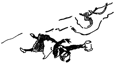 ПЕТЯ. Эй, подождите, я не могу, мне тяжело нести. (Кладет к ногам Мойры куклу.) Бабушка я не жадный: на тебе куклу. (Мойра смеется, Петя тащит двух коней и опять падает.) Ах, как они далеко уже. (Кричит.) Подожди-и-те! (Отдает Мойре маленького коня.) Бабушка, на и этого коня, мне тяжело. (Мойра зло смеется.) Подождите! (Голос Кота еще дальше «скорей!». Петя опять тащит, выбиваясь из сил.) ПЕТЯ (с плачем). Я не могу. А они уже чуть видны. Подождите!