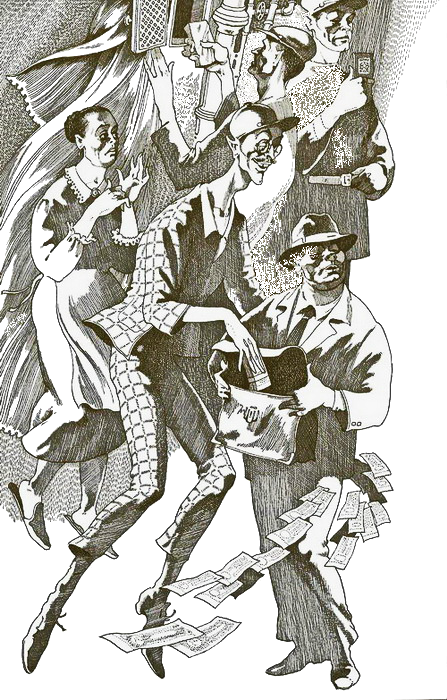 — Класс, класс! — восхищенно кричали за кулисами. А Фагот тыкнул пальцем в партер и объявил: — Колода эта таперича, уважаемые граждане, находится в седьмом ряду у гражданина Парчевского, как раз между трехрублевкой и повесткой о вызове в суд по делу об уплате алиментов гражданке Зельковой. В партере зашевелились, начали привставать, и, наконец, какой-то гражданин, которого, точно, звали Парчевским, весь пунцовый от изумления, извлек из бумажника колоду и стал тыкать ею в воздухе, не зная, что с нею делать. — Пусть она останется у вас на память! — прокричал Фагот. — Недаром же вы говорили вчера за ужином, что кабы не покер, то жизнь ваша в Москве была бы совершенно несносна. — Стара шутка, — послышалось с галерки, — этот в партере из той же компании. — Вы полагаете? — заорал Фагот, прищуриваясь на галерею. — В таком случае, и вы в одной шайке с нами, потому что она у вас в кармане! На галерке произошло движение, и послышался радостный голос: — Верно! У него! Тут, тут… Стой! Да это червонцы! Сидящие в партере повернули головы. На галерее какой-то смятенный гражданин обнаружил у себя в кармане пачку, перевязанную банковским способом и с надписью на обложке: «Одна тысяча рублей». Соседи наваливались на него, а он в изумлении ковырял ногтем обложку, стараясь дознаться, настоящие ли это червонцы или какие-нибудь волшебные. — Ей-богу, настоящие! Червонцы! — кричали с галерки радостно. — Сыграйте и со мной в такую колоду, — весело попросил какой-то толстяк в средине партера. — Авек плезир! — отозвался Фагот. — Но почему же с вами одним? Все примут горячее участие! — И скомандовал: — Прошу глядеть вверх!.. Раз! — В руке у него оказался пистолет, он крикнул: — Два! — Пистолет вздернулся кверху. Он крикнул: — Три! — сверкнуло, бухнуло, и тотчас же из-под купола, ныряя между трапециями, начали падать в зал белые бумажки. Они вертелись, их разносило в стороны, забивало на галерею, откидывало в оркестр и на сцену. Через несколько секунд денежный дождь, все густея, достиг кресел, и зрители стали бумажки ловить. Поднимались сотни рук, зрители сквозь бумажки глядели на освещенную сцену и видели самые верные и праведные водяные знаки. Запах также не оставлял никаких сомнений: это был ни с чем по прелести не сравнимый запах только что отпечатанных денег. Сперва веселье, а потом изумление охватило весь театр. Всюду гудело слово «червонцы, червонцы», слышались вскрикивания «ах, ах!» и веселый смех. Кое-кто уже ползал в проходе, шаря под креслами. Многие стояли на сиденьях, ловя вертлявые, капризные бумажки. На лицах милиции помаленьку стало выражаться недоумение, а артисты без церемонии начали высовываться из кулис. В бельэтаже послышался голос: «Ты чего хватаешь? Это моя! Ко мне летела!» — и другой голос: «Да ты не толкайся, я тебя сам так толкану!» И вдруг послышалась плюха. Тотчас в бельэтаже появился шлем милиционера, из бельэтажа кого-то повели. Вообще возбуждение возрастало, и неизвестно, во что бы все это вылилось, если бы Фагот не прекратил денежный дождь, внезапно дунув в воздух. Двое молодых людей, обменявшись многозначительным и веселым взглядом, снялись с мест и прямехонько направились в буфет. В театре стоял гул, у всех зрителей возбужденно блестели глаза. Да, да, неизвестно, во что бы все это вылилось, если бы Бенгальский не нашел в себе силы и не шевельнулся бы. 
