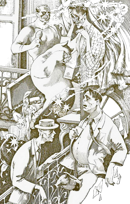 — Стремянку! — крикнули снизу. — Вызываю на дуэль! — проорал кот, пролетая над головами на качающейся люстре, и тут опять в лапах у него оказался браунинг, а примус он пристроил между ветвями люстры. Кот прицелился и, летая, как маятник, над головами пришедших, открыл по ним стрельбу. Грохот потряс квартиру. На пол посыпались хрустальные осколки из люстры, треснуло звездами зеркало на камине, полетела штукатурная пыль, запрыгали по полу отработанные гильзы, полопались стекла в окнах, из простреленного примуса начало брызгать бензином. Теперь уж не могло идти речи о том, чтобы взять кота живым, и пришедшие метко и бешено стреляли ему в ответ из маузеров в голову, в живот, в грудь и в спину. Стрельба вызвала панику на асфальте во дворе. Но длилась эта стрельба очень недолго и сама собою стала затихать. Дело в том, что ни коту, ни пришедшим она не причинила никакого вреда. Никто не оказался не только убит, но даже ранен; все, в том числе и кот, остались совершенно невредимыми. Кто-то из пришедших, чтобы это окончательно проверить, выпустил штук пять в голову окаянному животному, и кот бойко ответил целой обоймой. И то же самое — никакого впечатления ни на кого это не произвело. Кот покачивался в люстре, размахи которой все уменьшались, дуя зачем-то в дуло браунинга и плюя себе на лапу. У стоящих внизу в молчании на лицах появилось выражение полного недоумения. Это был единственный, или один из единственных, случай, когда стрельба оказывалась совершенно недействительной. Можно было, конечно, допустить, что браунинг кота — какой-нибудь игрушечный, но о маузерах пришедших этого уж никак нельзя было сказать. Первая же рана кота, в чем уж, ясно, не было ни малейшего сомнения, была не чем иным, как фокусом и свинским притворством, равно как и питье бензина. Сделали еще одну попытку добыть кота. Был брошен аркан, он зацепился за одну из свечей, люстра сорвалась. Удар ее потряс, казалось, весь корпус дома, но толку от этого не получилось. Присутствующих окатило осколками, а кот перелетел по воздуху и уселся высоко под потолком на верхней части золоченой рамы каминного зеркала. Он никуда не собирался удирать и даже, наоборот, сидя в сравнительной безопасности, завел еще одну речь. — Я совершенно не понимаю, — говорил он сверху, — причин такого резкого обращения со мной… И тут эту речь в самом начале перебил неизвестно откуда послышавшийся тяжелый низкий голос: — Что происходит в квартире? Мне мешают заниматься. Другой, неприятный и гнусавый, голос отозвался: — Ну конечно, Бегемот, черт его возьми! Третий, дребезжащий, голос сказал: — Мессир! Суббота. Солнце склоняется. Нам пора. — Извините, не могу больше беседовать, — сказал кот с зеркала, — нам пора. — Он швырнул свой браунинг и выбил оба стекла в окне. Затем он плеснул вниз бензином, и этот бензин сам собою вспыхнул, выбросив волну пламени до самого потолка. Загорелось как-то необыкновенно быстро и сильно, как не бывает даже при бензине. Сейчас же задымились обои, загорелась сорванная гардина на полу и начали тлеть рамы в разбитых окнах. Кот спружинился, мяукнул, перемахнул с зеркала на подоконник и скрылся за ним вместе со своим примусом. Снаружи раздались выстрелы. Человек, сидящий на железной противопожарной лестнице на уровне ювелиршиных окон, обстрелял кота, когда тот перелетал с подоконника на подоко