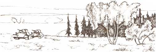 Куда ни посмотришь в зимнем лесу, всюду снег. Кругом комья, пласты и снежные кружева. Не сразу разберёшь, где ёлочка, где пенёк. Однако пеньки закрылись — и их не видно, а ёлочки обязательно где-нибудь да высунут колючую лапку. Небольшая ель запахнулась в белую шубу с головой и стоит себе. Будто тётенька, закутанная в пуховый платок. В руках у неё сумка хозяйственная: это ком снега так пристроился. Я чуть было «Здравствуйте» не сказал, когда ёлка слегка качнулась: думал, и впрямь кто-то идёт мне навстречу. А ёлочки-малютки в снежных комьях — словно совы белые расселись под большими деревьями. Весь лес убран снегом. К стволам, как гвоздями, сухими сучьями прибиты комья и комочки. Интересно! Я достал блокнот, погрел руки за пазухой и стал рисовать. Первой зарисовал ёлку-тётку в шубе, с сумкой. Затем снежную арку. Она похожа на низкие ворота — человеку не пройти. Только мышь проложила мелкую строчку, которую пересек заячий след... Дальше я иду не спеша и среди снежных фигур высматриваю диковины разные. Вот встретился на моём пути рыцарь. Это сосенка выставила свою вершину-крестик из комьев, похожих на шлем. Рыцарь с виду сердитый, недовольный чем-то. Таким я и нарисовал его. Подул на пальцы, перевёл взгляд кверху. Ба! Рябиновые кисти свесились надо мной. Опушённые снежком, они будто краснощёкие барышни-боярышни в белых шапках. — Здравствуйте! — сказал я и задел ветку. Боярышни дружно закивали, а шапки свои не уронили: холодно. Замёрз и я. Глянул с завистью на деревья в боярских шубах и побежал, быстро отталкиваясь палками, чтобы согреться.ДЕСАНТ