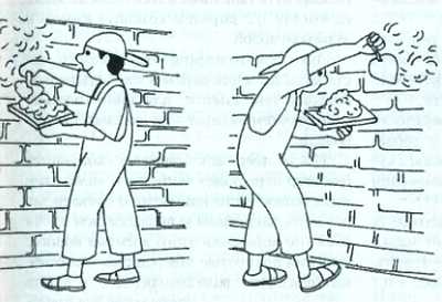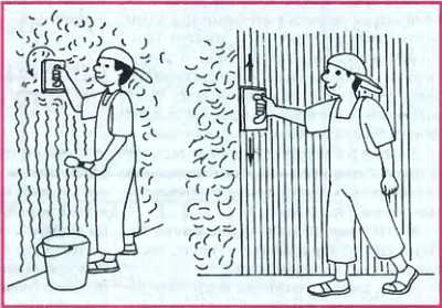 И тонкий, тонкий слой накрывки Процесс обычного оштукатуривания поверхности завершается нанесением, разравниванием, затиркой и заглаживанием накрывки. Итак, снова — делай раз. Правда, прежде чем сделать этот раз — приступить к нанесению раствора накрывочного слоя, необходимо грунт смочить и дать возможность влаге впитаться. Эта простая операция значительно улучшит сцепление накрывки с грунтом, что сообщает монолитность всей штукатурке. Накрывочный слой на подготовленную поверхность грунта можно наносить несколькими способами: набрасывать штукатурной лопаткой, намазывать с сокола или с полутерка. Технология каждого способа точно соответствует технологии нанесения этими же способами грунта. Теперь разровняем раствор полутерком и оставим оштукатуриваемую поверхность на некоторое время, дав ей возможность схватиться. И далее — поверхность нужно затереть теркой и загладить гладилкой. Порядок затирки штукатурки следующий: полотно терки прижимаем к поверхности штукатурки и делаем им круговые движения против часовой стрелки (затирка вкруговую). Затерев таким образом всю площадь поверхности, приступим к повторной затирке, но уже вразгонку, выполняя теркой прямолинейные движения. При повторной затирке устраняются кругообразные следы от затирки вкруговую. Производя затирку, обращайте внимание на отдельные дефекты поверхности и устраняйте их: в местах, где штукатурка имеет выступы, бугры — увеличиваем силу нажима на терку, в местах впадин — силу давления снижаем. Таким образом раствор перемещается по поверхности, уплотняется, а поверхность становится ровной и гладкой. Излишки раствора, собирающиеся на ребрах терки, удаляем отрезовкой. Очень часто вместо операции затирки при отделке штукатурки выполняют заглаживание. Эта операция осуществляется теркой, на полотно которой укрепляем резиновую прокладку либо стальную пластинку, и называться такая терка будет гладилкой. Заглаживание производим после нанесения накрывочного раствора и его разравнивания полутерком. Заглажку производят в два этапа и в двух направлениях: стены — сначала по вертикали, затем по горизонтали; потолки —сначала против света (от окна), затем по свету (к окну).