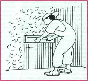 При намазывании раствора штукатурной лопаткой раствор помещают на сокол, его пододвигают к стене и тыльной стороной лопатки сгребают порцию раствора, намазывая его на поверхность. Способ намазывания раствора с сокола более производителен, но требует определенной сноровки: сила давления на сокол должна быть статичной, то есть постоянно одинаковой, иначе толщина наносимого слоя будет различной, а поверхность штукатурки — неровной. Намазывание раствора с сокола на стены осуществляется его движением снизу вверх, на потолок — короткими прямыми полосами, параллельными одному из лузг. Намазывание раствора с полутерка осуществляем следующим образом. По всей длине полутерка штукатурной лопаткой накладываем раствор, затем полутерок одной из продольных сторон прижимаем к оштукатуриваемой поверхности и продвигаем вдоль основания: по стене — снизу вверх; по потолку — от себя. При намазывании раствора данным способом статичность силы давления на полутерок имеет такое же значение для качества оштукатуренной поверхности, как статичность силы давления на сокол (в способе нанесения раствора с сокола). После того как вы покрыли раствором значительную площадь оштукатуриваемой поверхности (два-три квадратных метра), следует приступить к разравниванию грунта. Разравниваем раствор фунта полутерком. Движения полутерком можно производить в любом направлении: по вертикали, по горизонтали, по диагонали; главное, достигнуть конечной цели — получение чистой ровной поверхности. В процессе разравнивания исправляем имеющиеся дефекты: домазываем раствор там, где его недостаточно, либо срезаем излишки. Если намет грунта необходимо получить большой толщины, то его наносят в несколько приемов, в несколько слоев. Толщина каждого слоя не должна превышать 20 мм. Каждый последующий слой наносим только после схватывания предыдущего, не давая ему, однако, подсыхать. Разравниваем в этом случае только верхний слой грунта. И запомните заповедь штукатура: чем лучше вы разровняете слой грунта, тем легче вам будет производить накрывку и тоньше будет ее слой. По ходу разравнивания грунта проверяем качество оштукатуриваемой поверхности. Для этого проводим правилом по штукатурке снизу вверх, опирая его на маяки. Зазор между плоскостью правила и поверхностью штукатурки не должен быть более 4 мм и менее 2 мм (толщина накрывочного слоя).