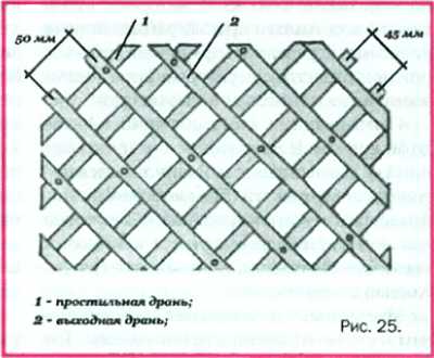Оштукатуривать можно практически любые поверхности — каменные и кирпичные кладки, бетонные плиты, деревянные поверхности и металлические балки — главное, правильно их подготовить. Первый этап одинаков для всех поверхностей — удаление масляных пятен: их или обрабатываем 5 %-ным раствором соляной кислоты, или вырубаем с помощью зубила и молотка. Дальнейший порядок подготовки поверхностей индивидуален для каждого вида. У каменных и кирпичных кладок перед оштукатуриванием вырубаются швы на глубину до 15 мм (если кладка не сложена в пустошовку). На камнях и кирпичах делаются насечки в виде полосок и ямок глубиной до 3–5 мм, по 1–2 штуки на каждом. Эта операция имеет целью обеспечить более прочное сцепление обрызга со стеной. Инструментарий для ее выполнения: зубило, троянка, зубчатка и бучарда. Затем поверхности кладок зачищают стальной щеткой, а пыль удаляют влажным веником. Бетонные плиты слишком гладкие, чтобы удержать на себе штукатурные слои, поэтому перед оштукатуриванием на них наносят насечку глубиной 3–5 мм и длиной 10–15 мм, используя те же инструменты, что и в предыдущем случае. Частота насечки — 200–250 углублений на каждый квадратный метр площади. После насечения поверхность очищают стальной щеткой и обеспыливают влажным способом. Деревянные основания подготовить к оштукатуриванию труднее всего. В первую очередь необходимо испытать стену или потолок на прочность крепления: они не должны прогибаться, шататься, вибрировать Затем доски, из которых состоят деревянные основания, следует надколоть, а в надколы вбить деревянные клинышки. Делается это для того, чтобы древесину не покоробило и «не повело» вследствие воздействия влаги, входящей в состав штукатурных растворов. Для удержания штукатурного слоя на деревянные стены и потолки набивают дрань. Предварительно дрань сортируют на простильную (более узкую), которая крепится непосредственно на поверхности, и выходную (более широкую). Сначала набивают простильную дрань, укрепляя ее двумя гвоздями под углом 45° к уровню пола и на расстоянии 40–45 мм друг от друга. Сверху набивают выходную дрань, она располагается перпендикулярно драни простильной и также под углом 45° к поверхности пола. В результате между дранями образуются ячейки 40х40 мм — для потолка или 45х45 мм — для стен. Гвозди по выходной драни набивают приблизительно через 100 мм, располагая их на пересечении простильных и выходных драниц (рис. 25.).