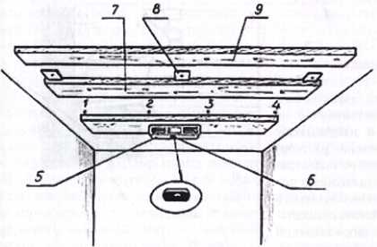 Рис. 28. Провешивание горизонтальных поверхностей с использованием строительного уровня: 1–4 — гвозди, 5 — строительный уровень, закрепленный на плоскости правила, 6 — визирное окошко строительного уровня, 7 — правило, 8 — марки, 9 — маяк