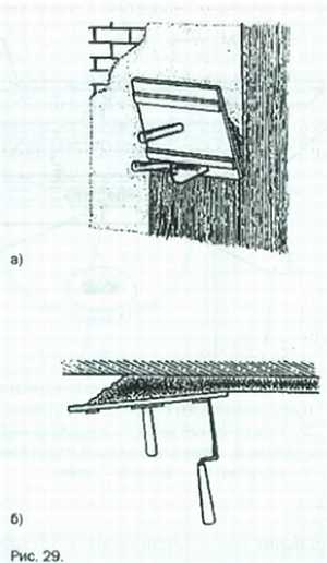 Слой второй — грунт Создание второго слоя штукатурки — грунта — в одну операцию нанесения раствора не укладывается. Поэтому делаем раз — наносим грунт на основание. Грунт наносится на схватившуюся, но еще влажную поверхность обрызга (если поверхность подсохла, то ее следует увлажнить). Раствор наносится штукатурной лопаткой, с сокола (рис. 29) или с полутерка.