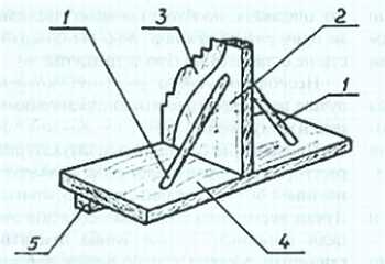 Рис. 31. Простой шаблон для вытягивания прямолинейных фигурных тяг: 1 — подкосы, 2 — профильная доска, 3 — оковка из кровельной стали, 4 — салазки, 5 — полозок