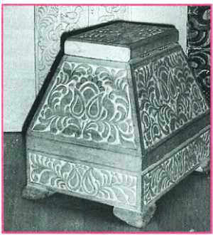 Крышка коробочки на разных стадиях изготовления: 1 — подготовительный рисунок; 2 — резьба с подушечным фоном; 3 — резьба с подборным фоном; 4 — крашение и отделка