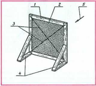 Сетка для получения фактуры «набрызгом»: 1 — деревянная рамка; 2 — сетка; 3 — проволока; 4 — планки стойки; 5 — направление набрасывания раствора.