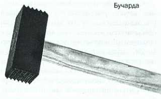 Ровную зернистую поверхность можно получить, если нанесенную накрывку из раствора для каменных штукатурок разровнять, уплотнить, а по началу схватывания растворной смеси — затереть терками. В зависимости от зернового состава заполнителя получаем мелкозернистую, среднезернистую или крупнозернистую поверхность. Полузатвердевшую каменную накрывку можно обработать циклеванием под фактуру «мелкая борозда». Лучшим заполнителем для каменных растворов, предназначенных для циклевания, считается мраморный песок с размерами зерен не более 1,5 мм. Раствор наносим на подготовленный, выдержанный и увлажненный грунт обычным порядком. Затем поверхность штукатурки разравниваем, уплотняем и выдерживаем один день, в течение которого один-два раза подвергаем увлажнению. Через день можно приступать к циклеванию. Циклевание производим по правилу, двигая по нему цикли, как по направляющей. Для получения четкого рисунка бороздок нажим на циклю следует делать сильный, а проводить по одному и тому же месту штукатурки нужно несколько раз. Форма иразмер борозд зависит от профиля зубьев цикли. Для силовой обработки бучардой, зубилом, троянкой, зубчаткой или шпунтом поверхность выдерживаем 6–8 дней во влажном состоянии и 1–2 дня в сухом. Затем всю поверхность разбиваем на отдельные камни. Контуры камней намечаем мелованным шнуром, а пробивку швов или рустов производим троянкой или зубчаткой. Теперь можно приступать к обработке под различные фактуры. Каменную «шубу» получаем паковкой затвердевшей накрывки бучардами или шпунтом. Бучарда с мелкими зубьями создает мелкозернистый «воре», бучарда с крупными зубьями — крупнозернистый, а паковка шпунтом — особо крупнозернистый. Если использовать бучарду не с зубьями, а с лезвиями, то поверхность «шубы» будет штрихованной. Фактуру «под дюны» воспроизводим с помощью стальных щеток и зубила. Сначала поверхность обработаем стальными щетками, удаляя верхнюю пленку цементного раствора и обнажая зерна заполнителя. Затем зубилом делаем частые одинаково небольшие насечки. Образующиеся при этом углубления и создают видимость песчаных дюн. Аналогичным способом можно получить фактуру «под рваный камень». В этом случае углубления делаются разной величины, а расположение их — хаотическое. Для создания особо глубоких и тонких «ран» используем шпунт. Если хорошо выдержанную накрывку обработать рашпилем, то полученная фактура будет напоминать пиленый природный камень. Для всех ударных инструментов, используемых при обработке терразитовых и каменных штукатурок, характерен один недостаток: их зубья очень быстро стираются и тупятся. Поэтому, приступая к обработке этих штукатурок, запаситесь точилом для инструментов или инструменты подбирайте не в единичных экземплярах, а по нескольку дублей. Процесс травления каменных штукатурок кислотой не более трудоемок, чем обработка бучардами. Напротив, данный вид обработки значительно производительнее, а оштукатуренная поверхность — долговечнее. Правда, травлением можно получить только одинаковые по рельефу фактуры, но от этого не теряется эстетическая привлекательность каменных травленых штукатурок. Итак, травление кислотой. Для начала отметим то, чего при устройстве травленых каменных штукатурок делать не стоит — применять в качестве красящих вещест